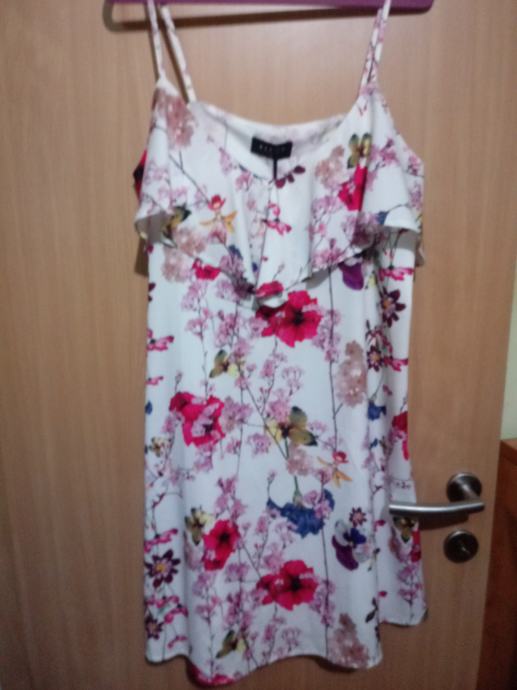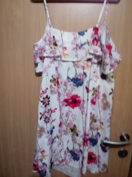 Prodajem novu haljinu Mohito, vel. 40, cvjetnog uzorka. Haljina je na bretele, V izrez oko kojeg je volan. Haljina prekrasno pada, na bijeloj podlozi vrlo lijep šareni uzorak. Može biti iznad ili do koljena (ovisi o visini osobe).