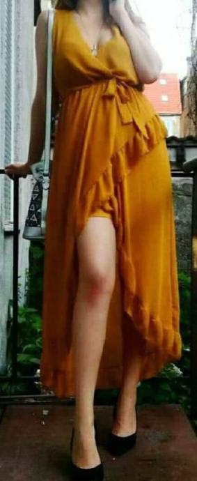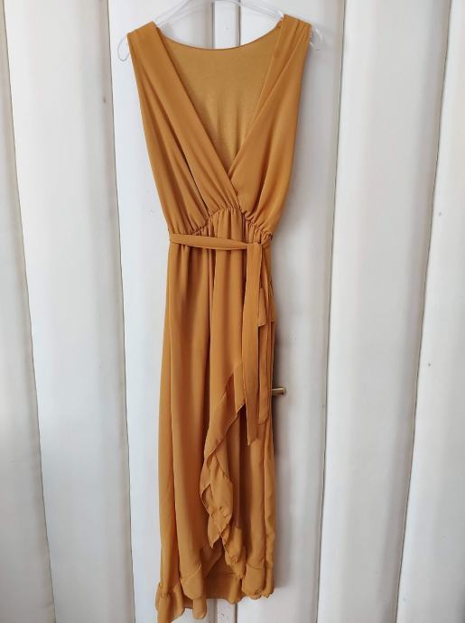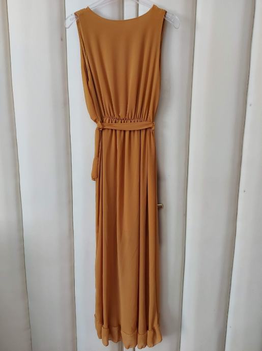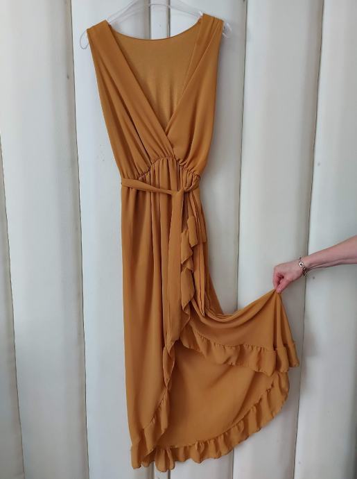 Haljina boje senfa, leprsava, lagan materijal sa podstavom. Vel M