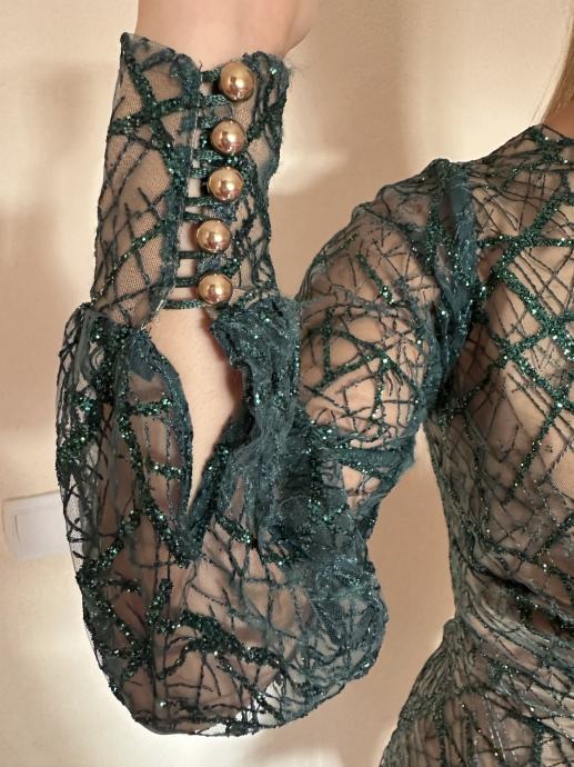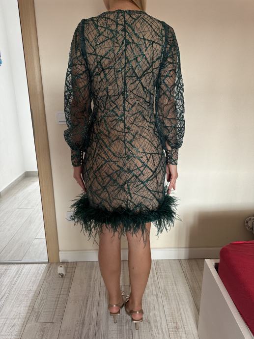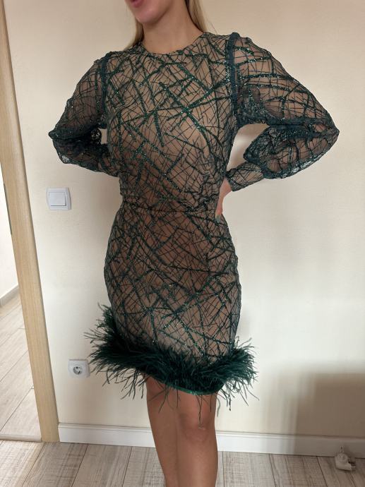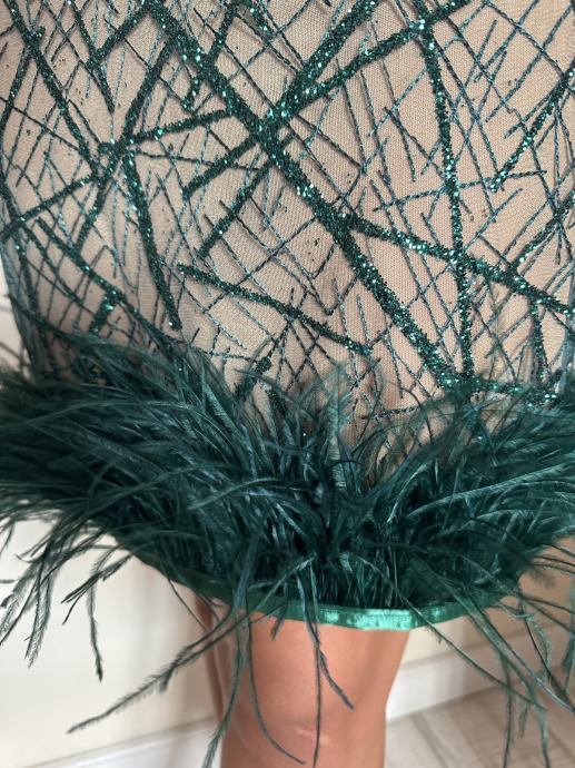 Prodaje se haljina dizajnerice Ivane Jurić. Veličina između S i M. Smaragdno zelene boje sa zelenim šljokicama i zelenim perjem, duzine iznad koljena; zlatni dugmići. Podstava boje kože. Jednom nošena.