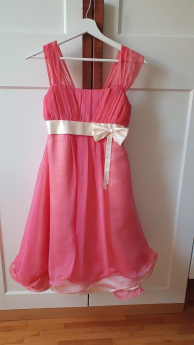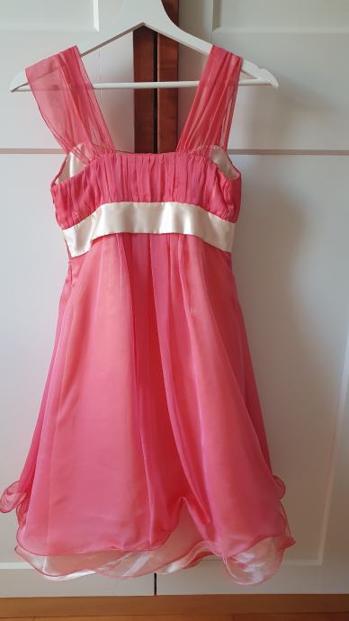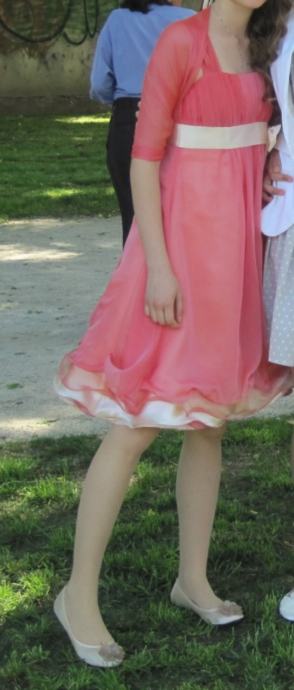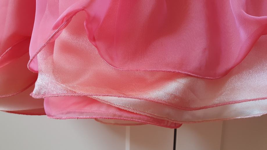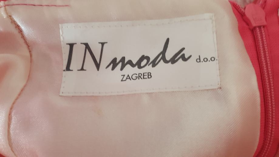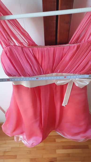 Haljina je tamno losos/ružičaste boje, izrađena od 100% svile – mekana i luksuzna na dodir. Rađenom po mjeri u butiku u Zagrebu. Nošena je samo jednom.