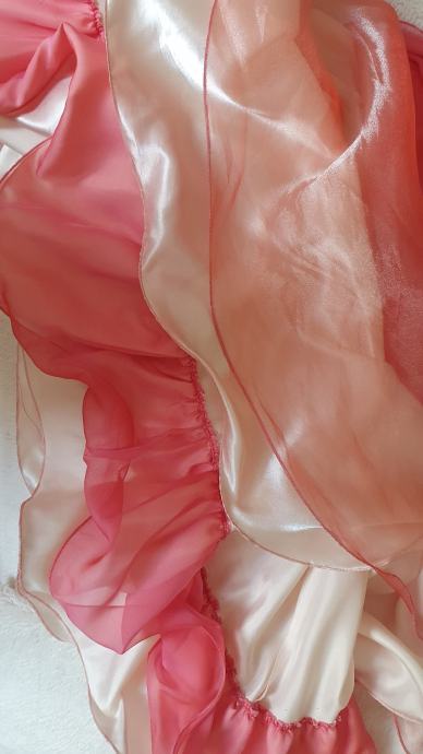 Haljina ima četiri sloja podstave, što joj daje volumen, zaobljenost i lepršavost. Zadnja podstava dodatno je ojačana tankom žicom na rubu kako bi zadržala puni oblik. Uz haljinu dolazi i odgovarajući svilenkasti pareo dužine