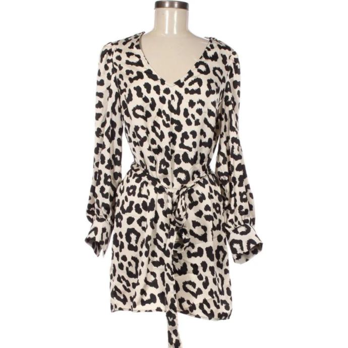 Ova haljina s upečatljivim leopard uzorkom prepoznatljiv je model H&M brenda. Riječ je o kratkoj haljini izrađenoj od laganog satenskog materijala koji se ističe modernim i ženstvenim detaljima. Kroj na preklop ("Wrap" style). Haljina ima duboki V-izrez i veže se u struku pripadajućim pojasom od iste tkanine, što naglašava figuru.