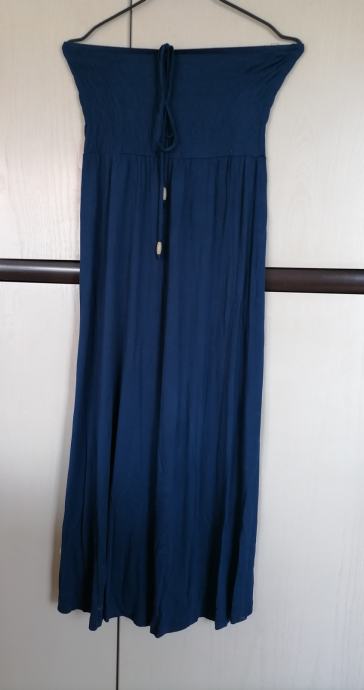Duga lagana haljina za ljeto, tamnoplave boje, sa elastičnom gumicom u predjelu prsa i sa vezanjem oko vrata, veličina 38/40.