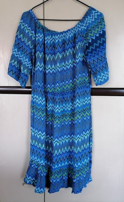 Prekrasna prozračna haljina za ljeto, nikad nošena, pretežno plave boje sa uzorkom, sa rukavima koji lagano padaju i elastičnom gumicom u gornjem dijelu haljine, veličina XL.