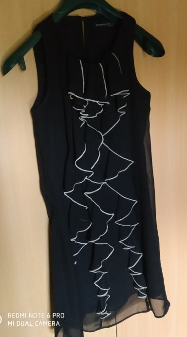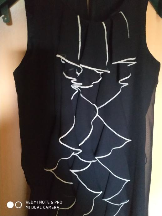Prodajem haljinu malu koktel crnu sa volanima sa prednje strane i kopčanjem na leđima gumbima.