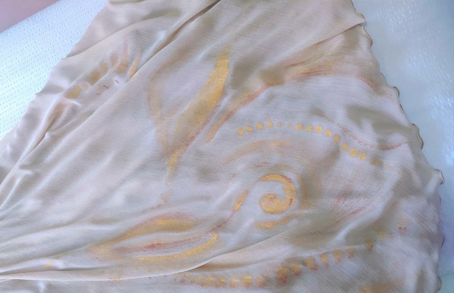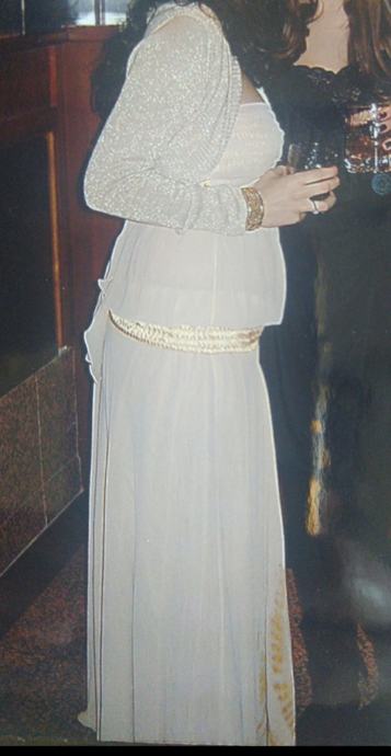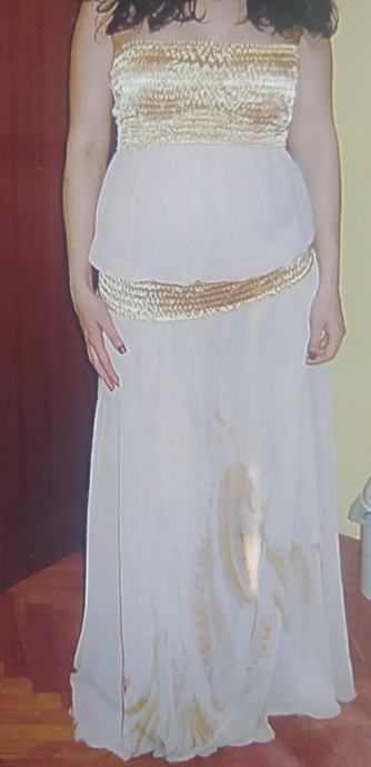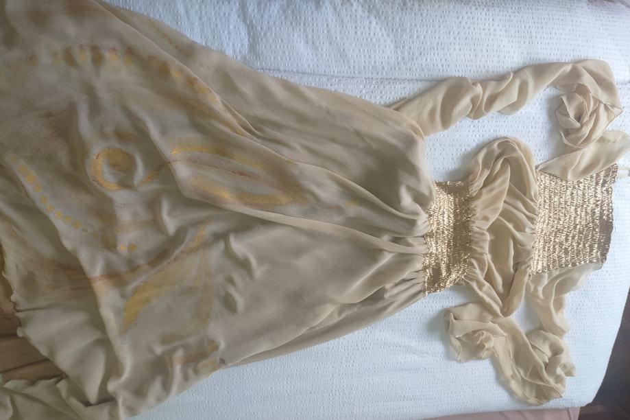 Haljina modnog para Arileo,bež/zlatne boje,ručno oslikana,nosiva na više načina,prilagodljive duljine i širine.Nošena jednom,kemijski očišćena.