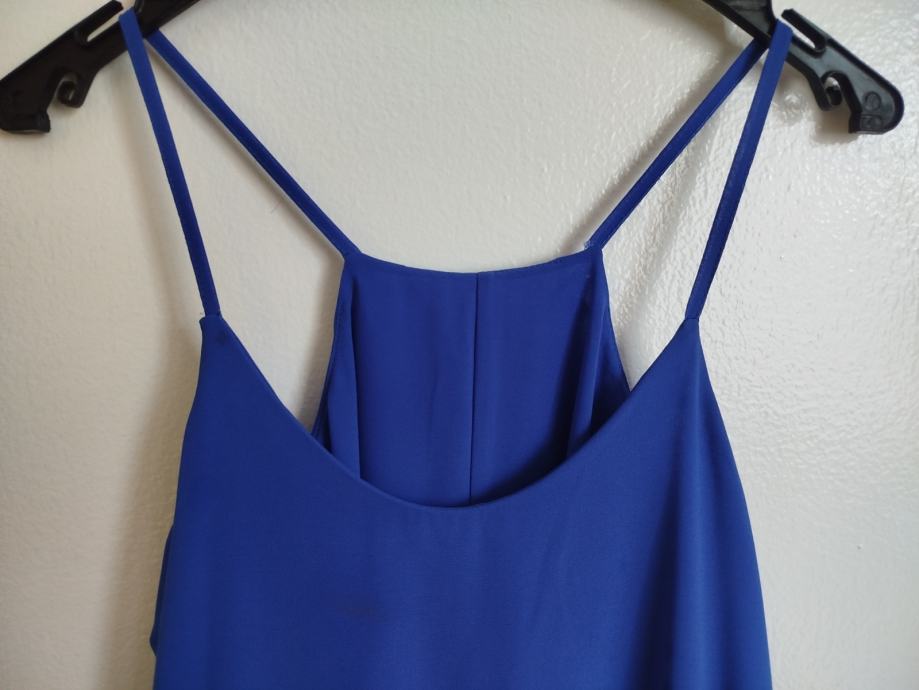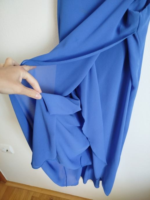 Haljina je nošena jednom na zabavu. Haljina na bretele. Iza je je malo duža nego naprijed. Veličina M. Ima postavu. Naprijed se tkanina preklapa. Dužina s prednje strane do koljena. Boja kraljevsko plava. Materijal prozračan i lepršav.