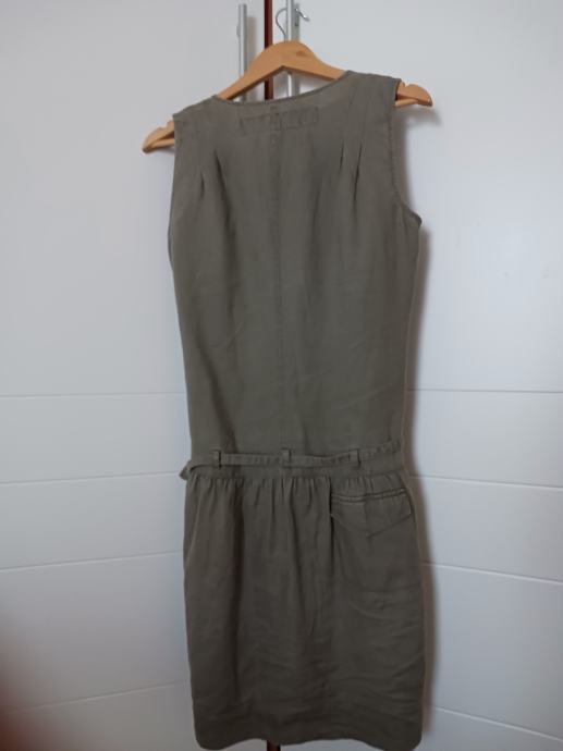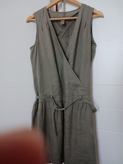 Prodajem rabljenu zelenu lanenu haljinu veličine 38, koja je bez rukava i seže iznad koljena. Savršena za tople ljetne dane, ugodnog je materijala i prozračnog kroja.