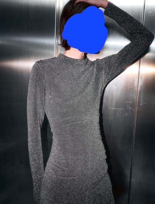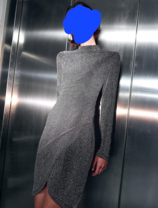 Haljina srebrna sa sjajem, dođe uz tijelo, raztezljivi material.