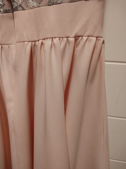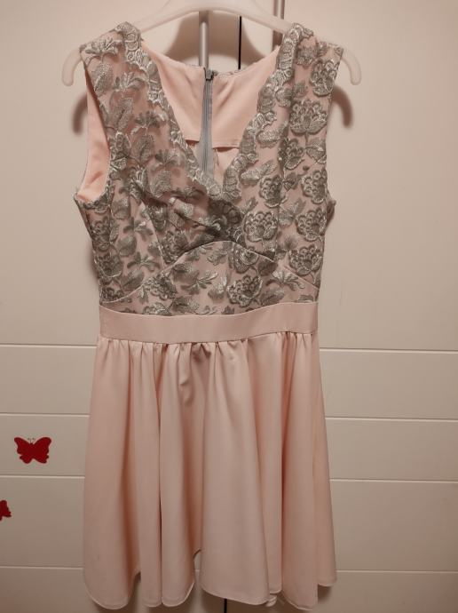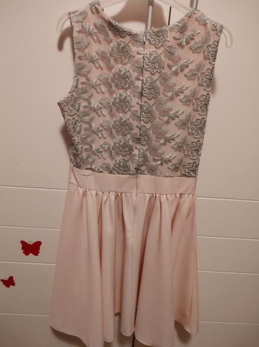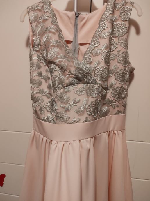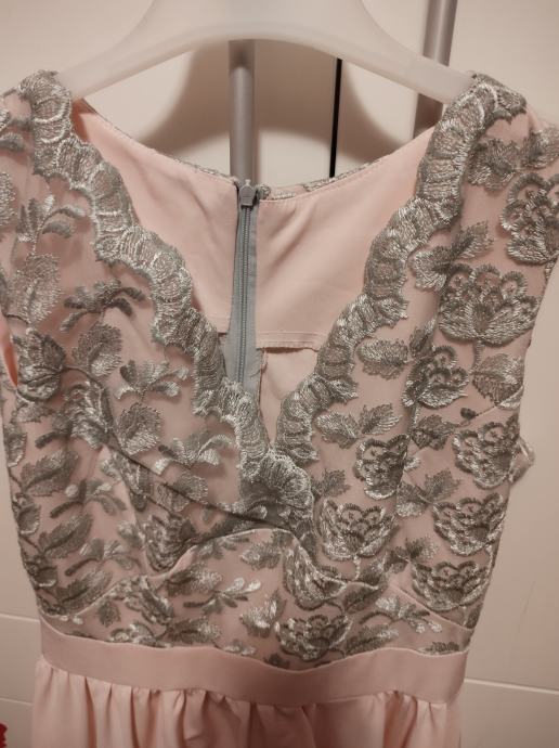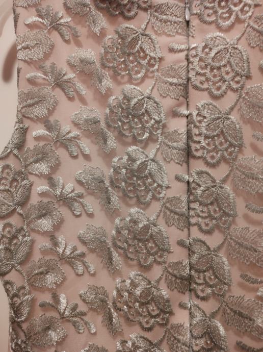 Haljinica, nježne roza boje s bogatim sivim vezom (čipka). Vel. 40 (38). Dužina 88cm (do pasice struka 36cm)