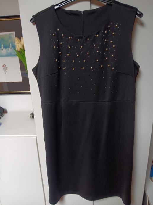 Crna svečana haljina s imitacijom bisera u gornjem dijelu. Dužina 98 cm, širina u struku 100 cm. Lijepo pristaje, laska figuri. Jednom obučena.