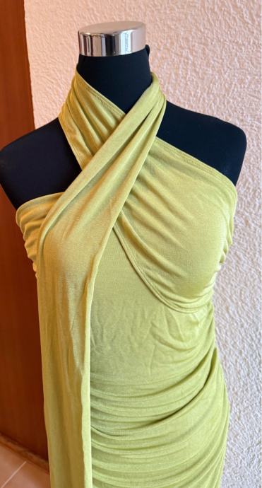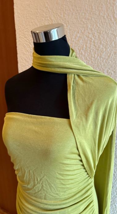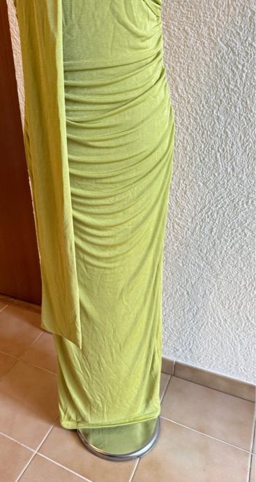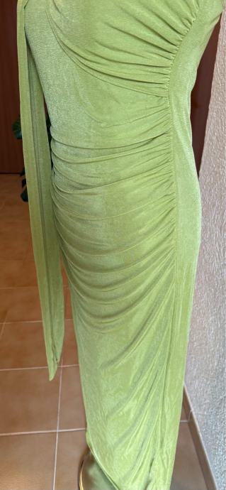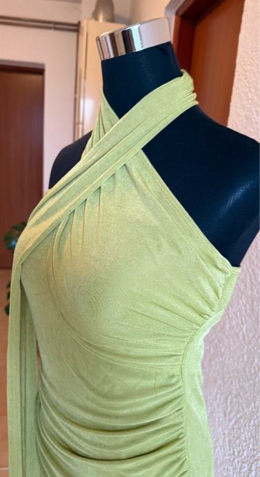 Predivna i efektna haljina u modernoj zelenoj nijansi, idealna za svečane prilike, večernje izlaske, vjenčanja ili posebne događaje. Haljina lijepo prati liniju tijela i ističe figuru zahvaljujući bočnim naborima.