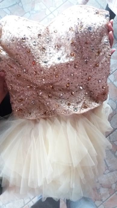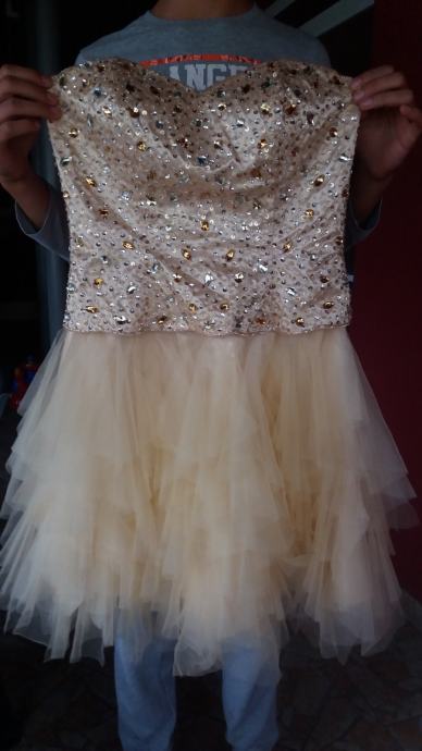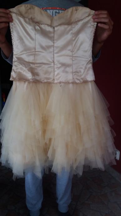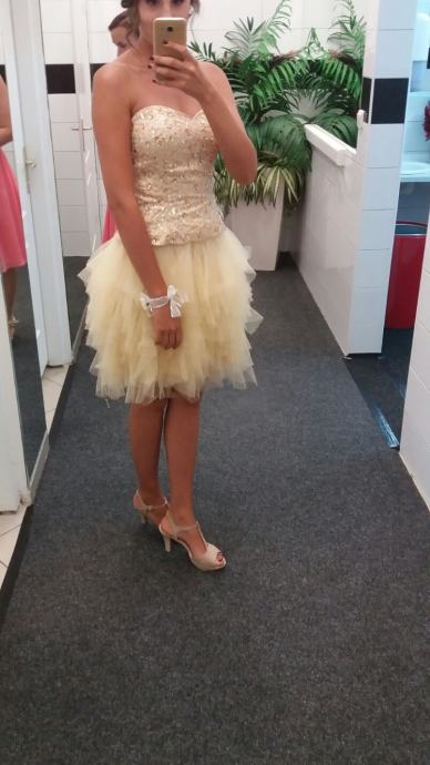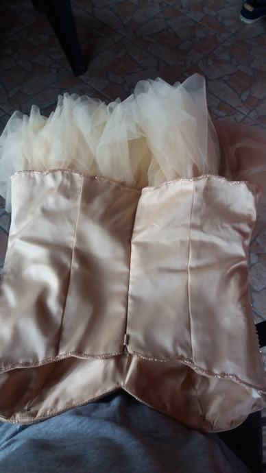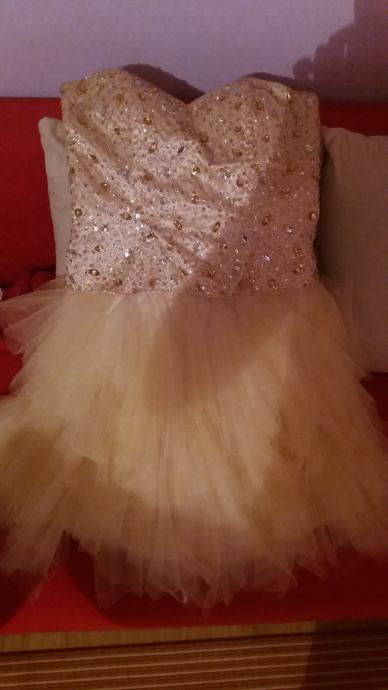 Prodajem svecanu haljinu koja je nošena jednom. Haljina je kupljena vani i savršena je za vjenčanja i maturalne. Potpuno je nova i jako dobro očuvana. Uz haljinu ide i til za ramena. Veličina haljine je 38. Boja je između zlatne i žute.