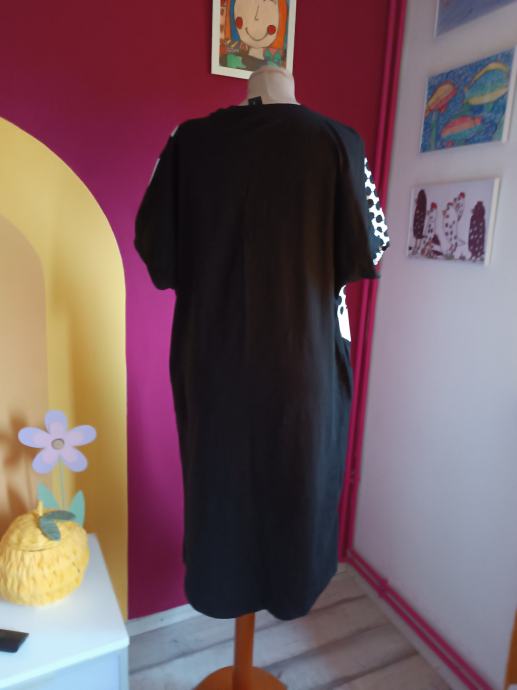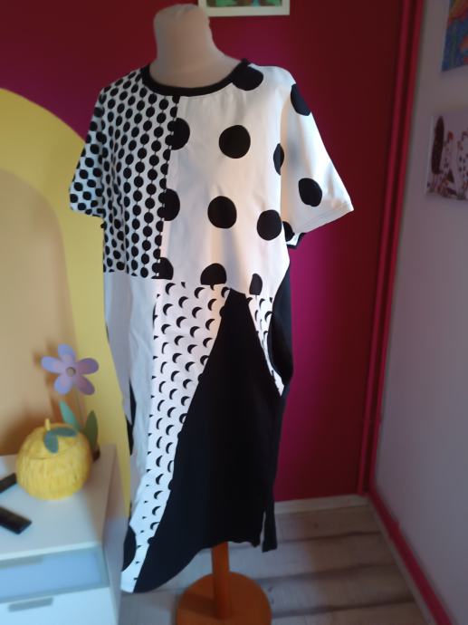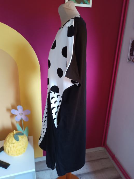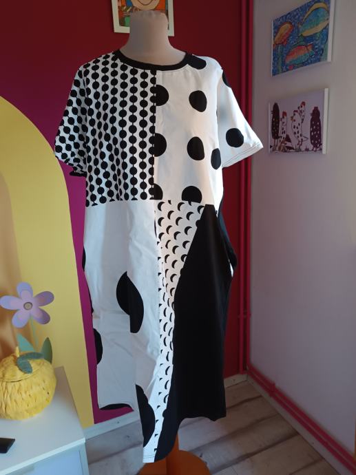 Prekrasna ljetna haljina s točkama. Upečatljiva, posebna. Kvalitetni materijal (95 % pamuk i 5 % elastin). Sa svake strane se nalaze džepovi.