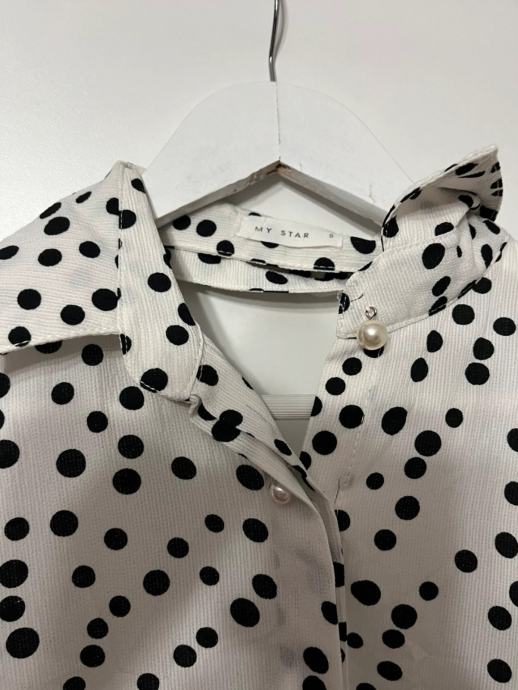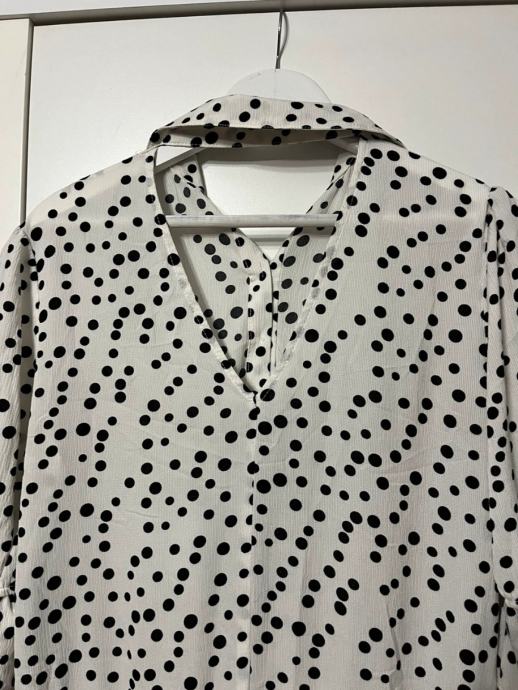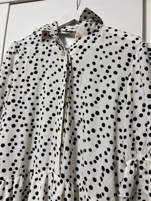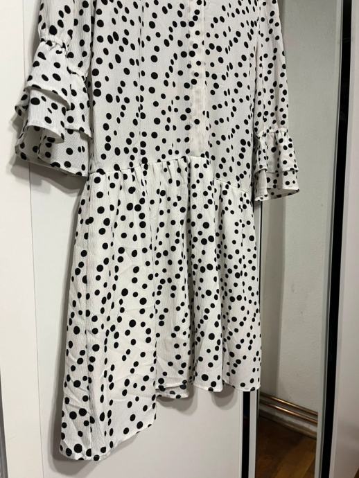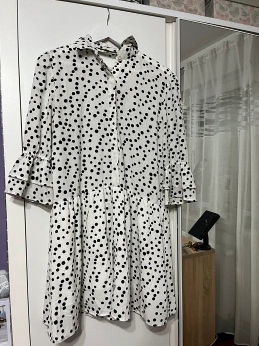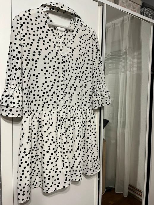 Prodajem haljinu na točkice, bijele boje s crnim točkicama. Haljina ima kroj s volanima na donjem dijelu i rukavima, te ovratnik s mašnom. Veličina je 36.