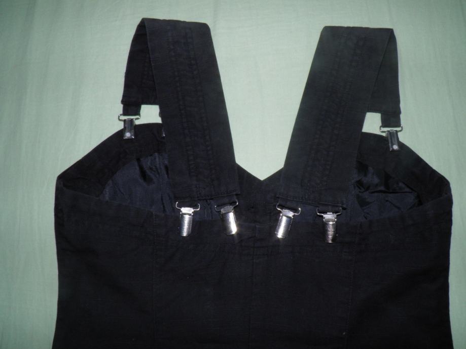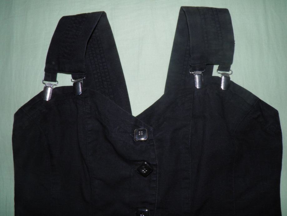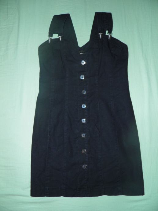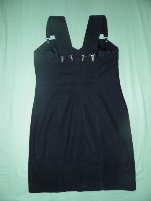 Posebna haljina crne boje, koja se može nositi sa tregerima ali i bez. Nošena i uščuvana. Vel. 38, 100% pamuk. Iznutra ima podstavu i na njoj rezervni gumb. Duljina bez tregera 69 cm, sa tregerima 81,5 cm. Prsa 42 cm, širina skroz dolje na rubu 47,5 cm. Blago strukirana, visoki struk.