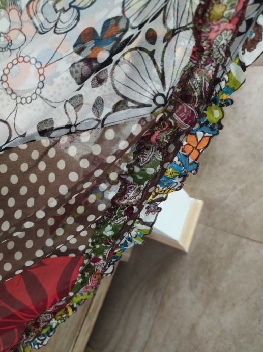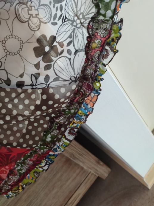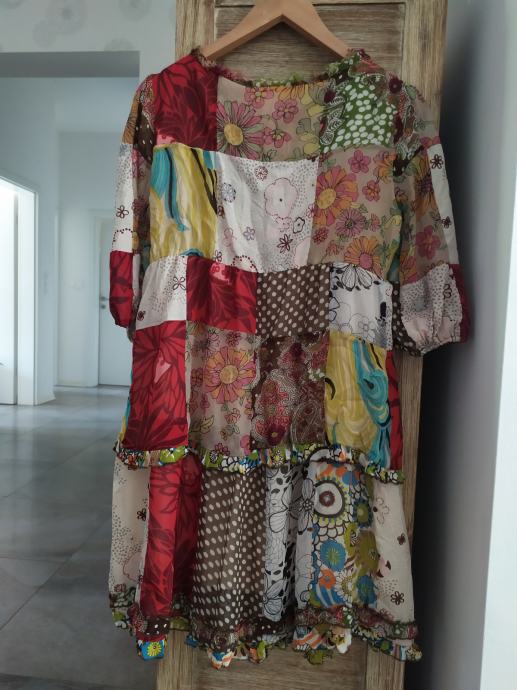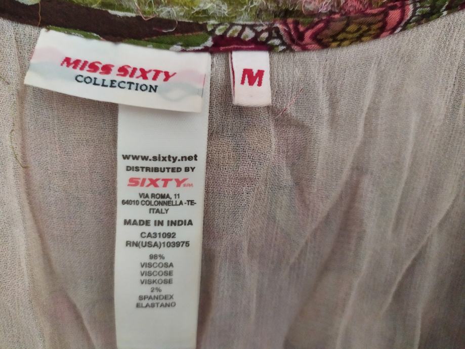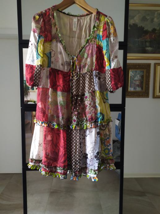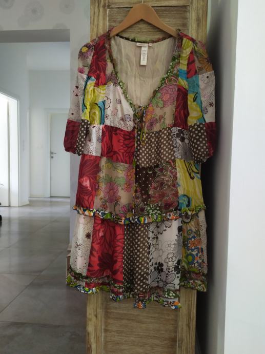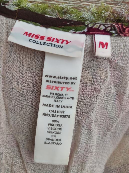 Prodajem haljinu marke MISS SIXTY vl.M po cijeni 17 eura . Haljina je od viskoze a i podstava je od viskoze. Haljina je posebna i atraktivna. Ispod prsiju je sječena i šav je elastičan i rastezljiv. Rukavi su 3/4 sa gumicom na krajevima. Tkanina podstave ima elastina u sebi. Oko vratnog izreza haljina ima ocufani volančić. Haljina je malo nošena i očuvana, nema nikakvih oštećenja na sebi.