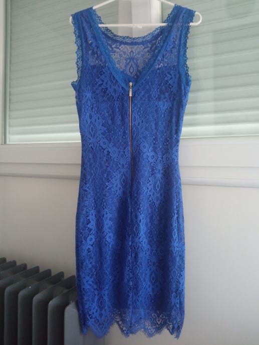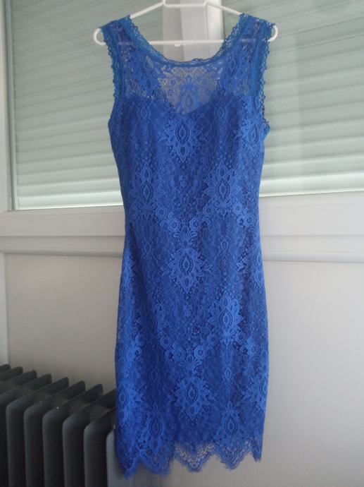 Plavu čipkastu haljinu dužine do koljena, materijal mekan i udoban lijepo prati liniju tijela, bez rukava, jednom nošena ( 10 eur )