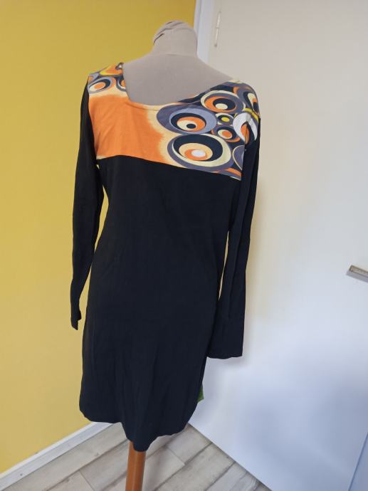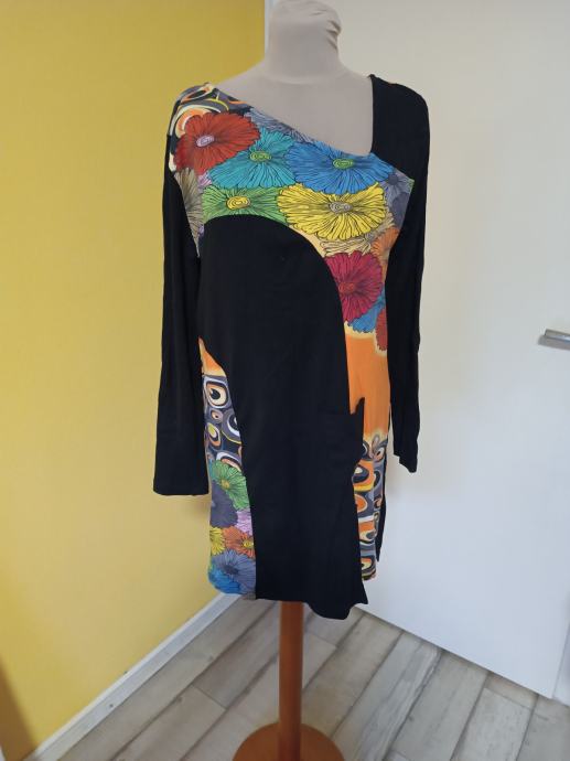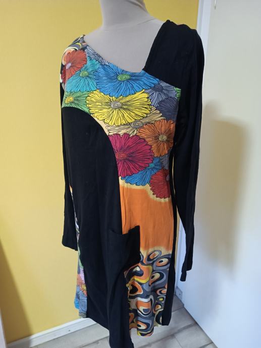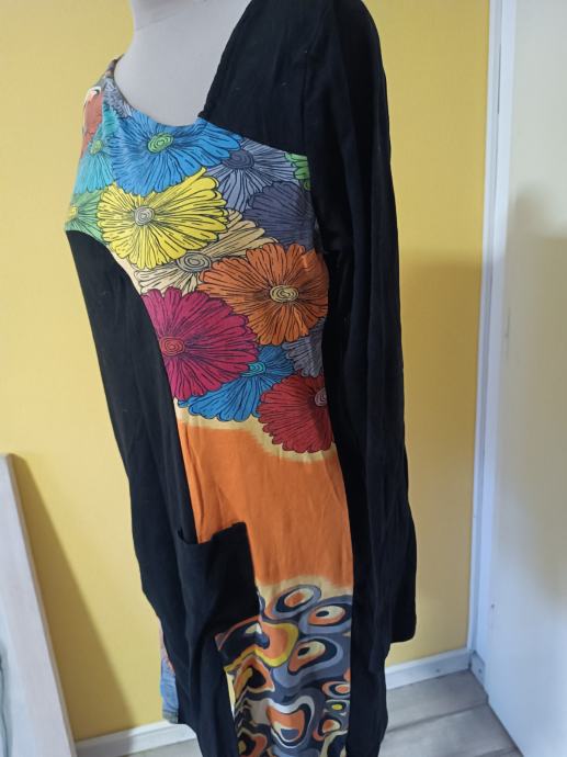 Predivna haljina, šaren cvjetni uzorak, moderna, s neobičnim izrezom. Dijelovi materijala u jarkim bojama. Džep na prednjoj strani.