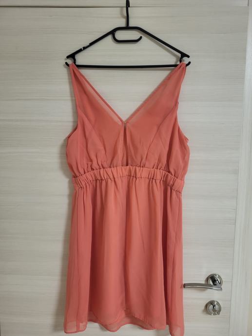 Elegantna haljina u prekrasno koraljno-ružičastoj boji, savršena za ljetne prilike. Haljina ima romantičan V-izrez i tanke bretele. Struk je naglašen elastičnom trakom koja oblikuje figuru, a haljina je lagano A-kroja. Veličina L.