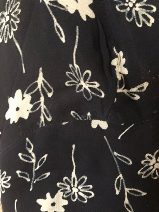 Tamno plava haljina s bijelim uzorkom, dužine 90 cm. Zatvarač sa stražnje strane, umeci od plavog protirnog žoržeta. Veličina 36/38.