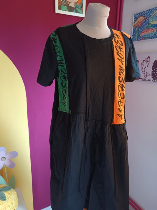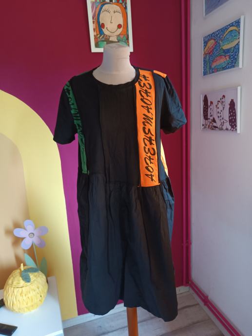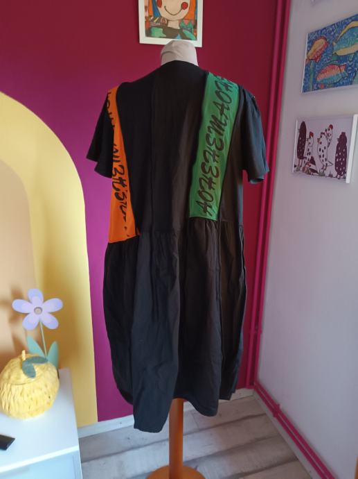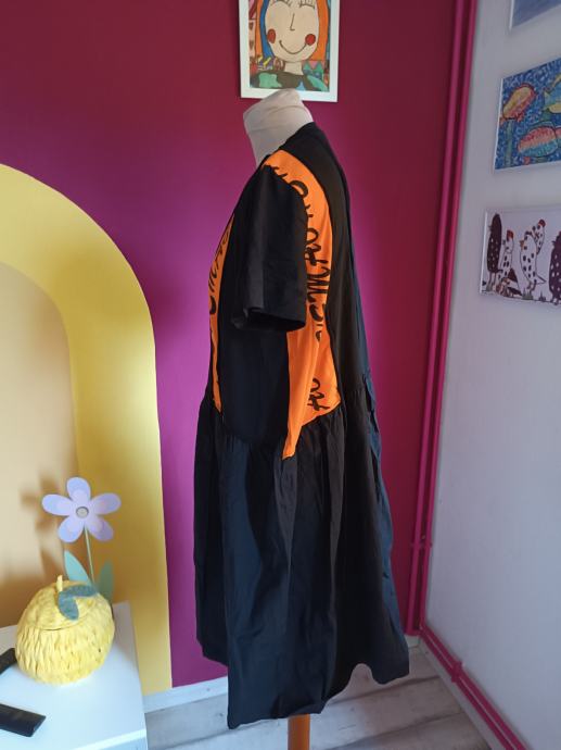 Ugodna ljetna haljina koja ima naranačaste, zelene dodatke s natpisom. Rađena od 95 % pamuka i 5 % elastina. Zanimljiva s crnim trakama s kojima se možete poigrati i suziti haljinu.