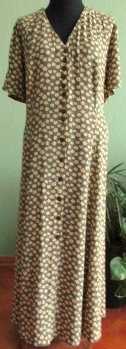 Prekrasna vintage haljina od teškog prirodnog materijala koji lijepo pada - po teksturi nešto kao indijsko platno. Krasni uzorak zelene livade sa žutim cvjetovima. Kopčanje po cijeloj dužini, pojas u visini struka, kratki rukavi. Haljina se širi zvonoliko prema rubu sa prorezima na prednjoj strani. Veličina XXL, u savršenom stanju.