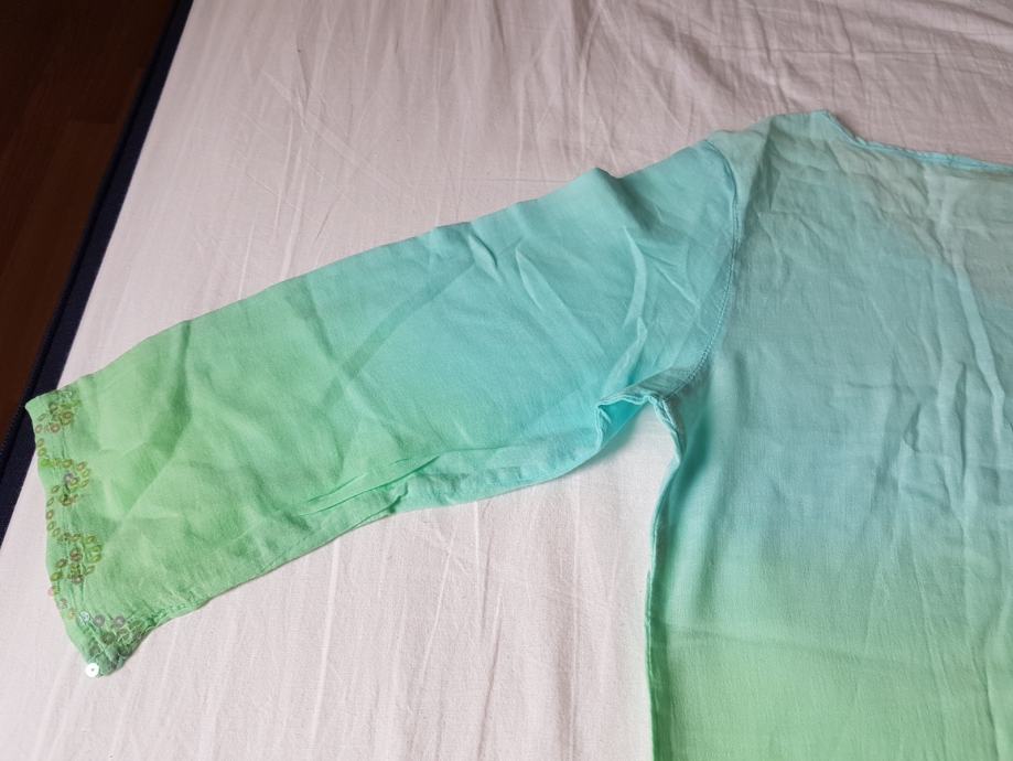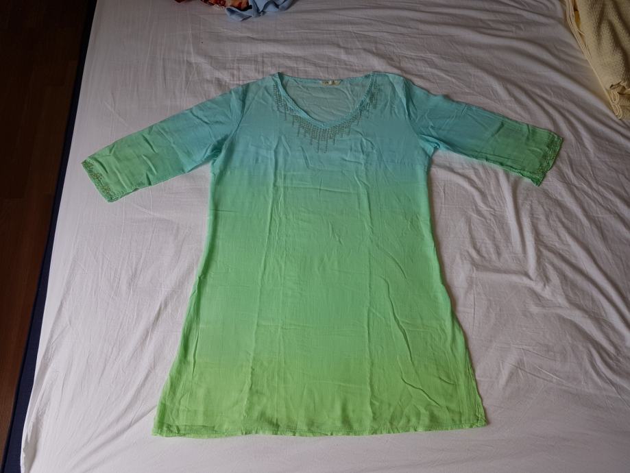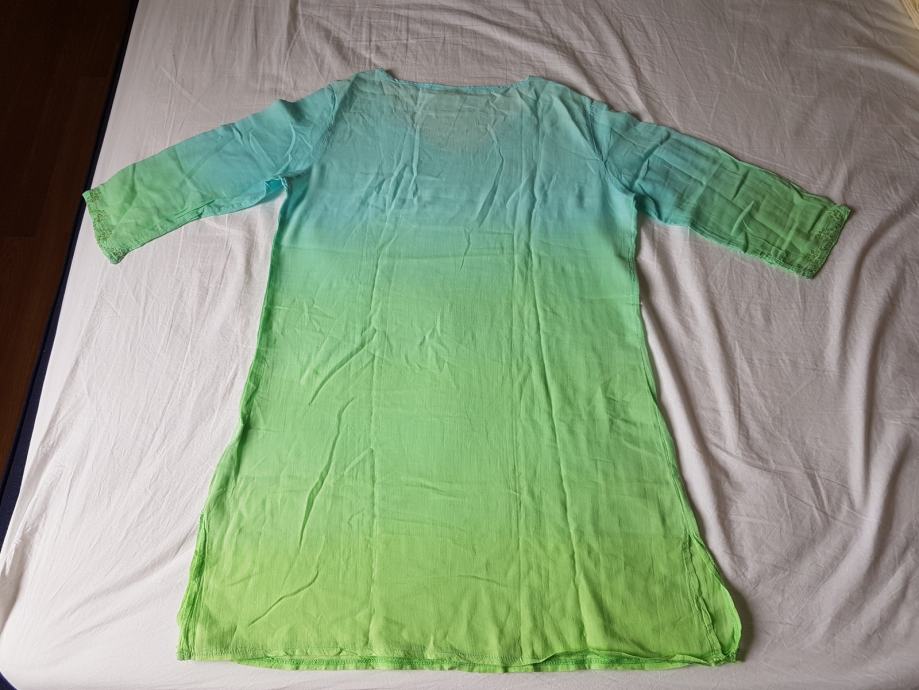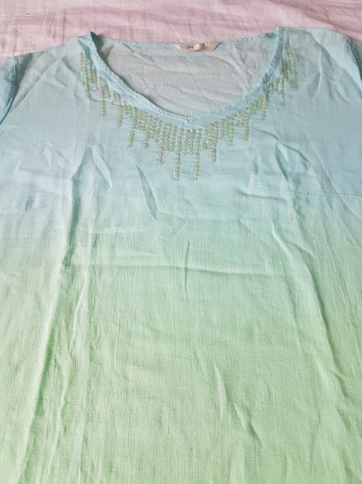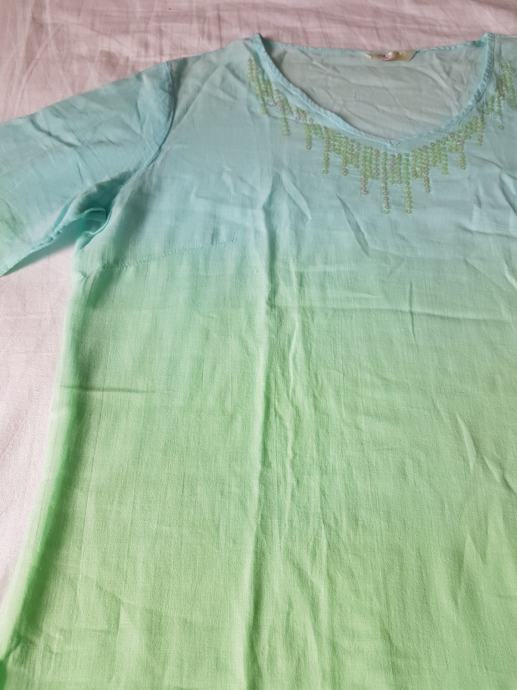 Pamučna haljina za plažu, iznad koljena, svijetloplave i zelene boje, sa malo šljokica. Lagana, savršena za ljeto i plažu. Malo nošena, očuvana. Veličina L.