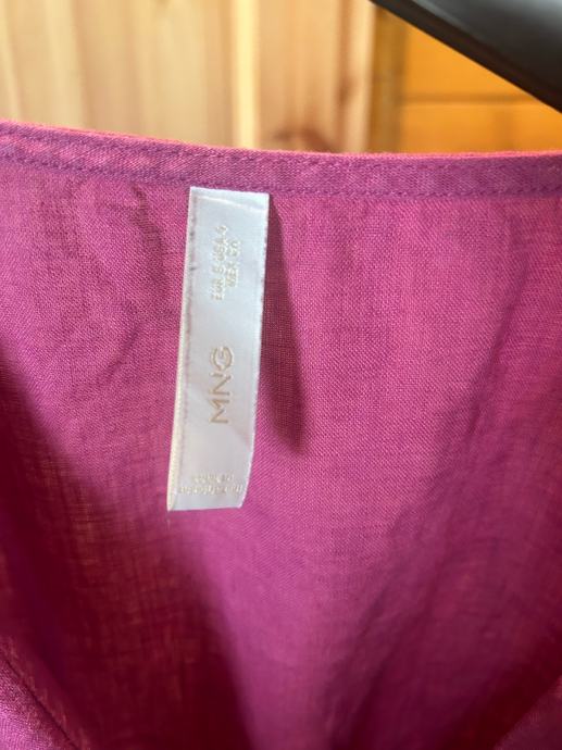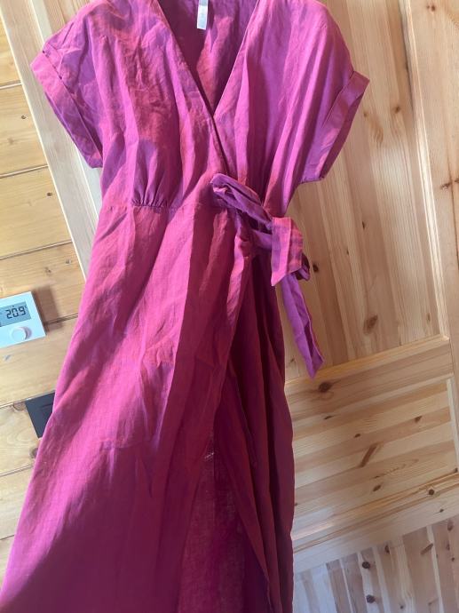 Prodajem Mango ljetnu haljinu od 100% lana u rozoj boji, veličine 36. Haljina je wrap kroja s V izrezom, kratkim rukavima i vezanjem u struku, što daje lijep, ženstveni siluet. Dužina pada ispod koljena. Lan je ugodan za nošenje po toplom vremenu jer je prozračan i lagan.