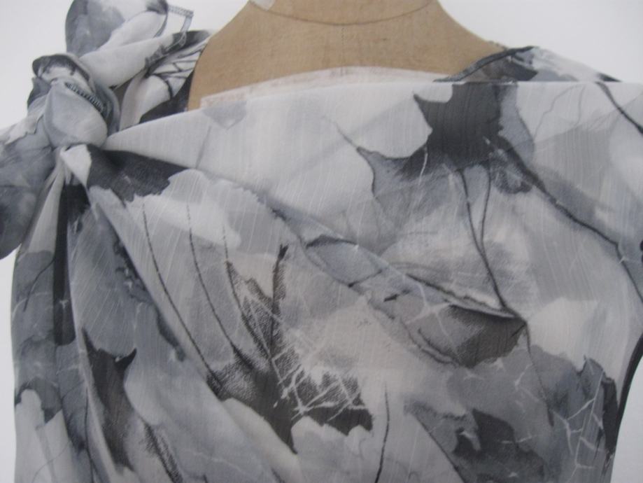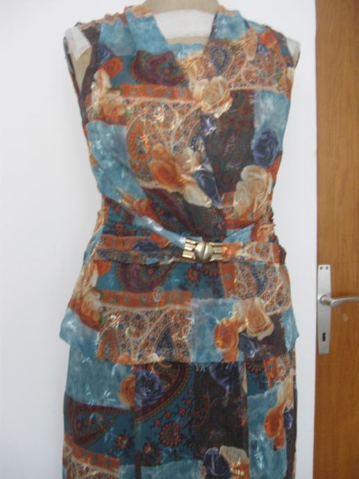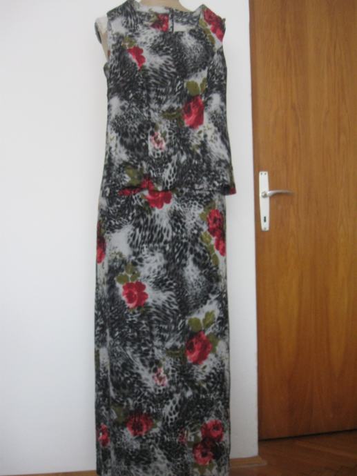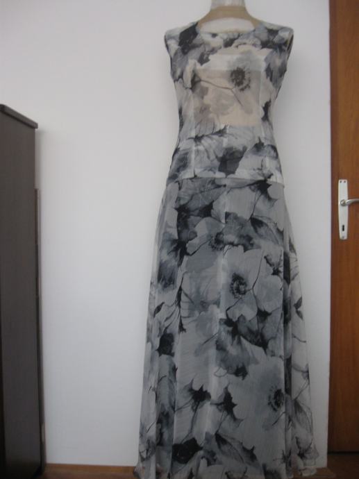 1. Sivo-crna dvodjelna duga haljina od muslina, vel.38, gornji dio bez rukava. Uz nju veliki šal.Cijena 15 eura.