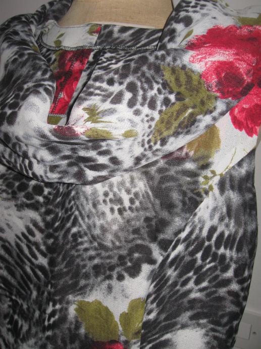 2.Cno-siva duga, dvodjelna sa crvenim cvjetovima isto ima šal, vel.38,cijena 15 eura.