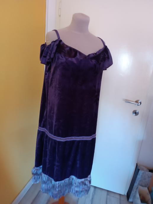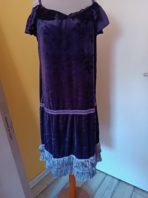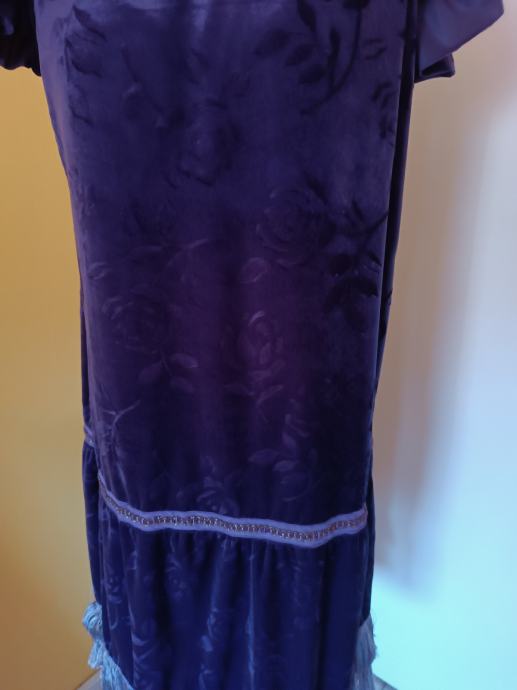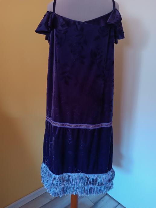 Ljubičasta haljina, opušteni kroj, ukrasi s resicama. Rađena od neobičnog materijala poput baršuna koji ima reljefne ružice. Gornji dio ima volane na naramenicama. Na sredini haljine nalazi se ukrasna traka. Ručni rad. Zaplešite u njoj čarlston na ljetnim terasama.