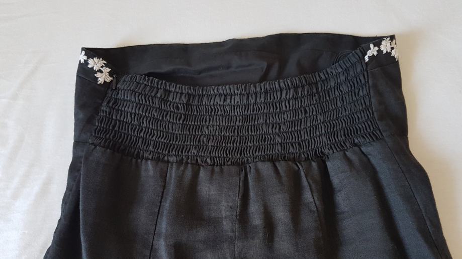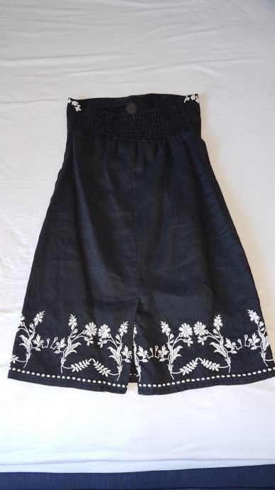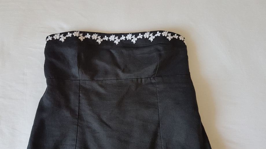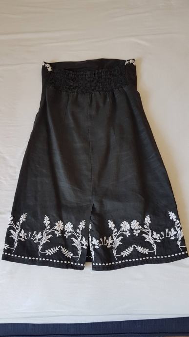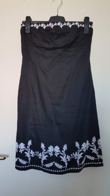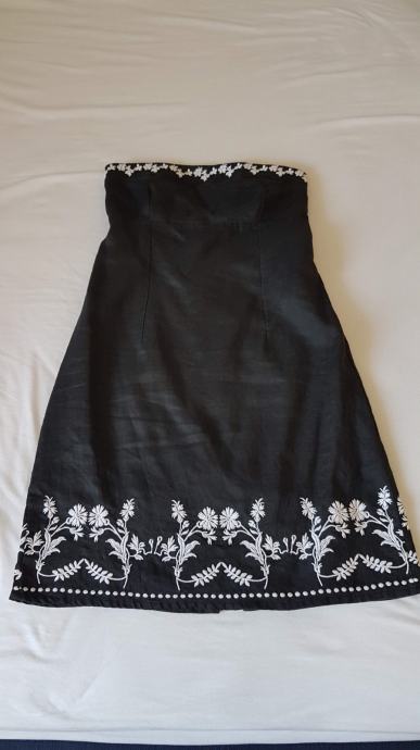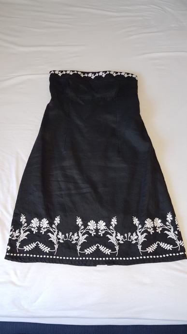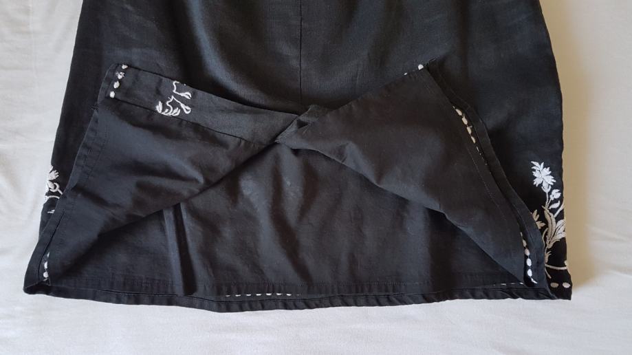 Mango haljina crne boje sa detaljima izvezenog bijelog cvijeća, gornji materijal je lan a iznutra je podstavljena pamučnim materijalom, tako da je ugodna za nositi. Uska, uz tijelo. Ima šlic na bočnoj strani, dužine iznad razine koljena. Veličina L. Malo nošena, bez oštećenja.