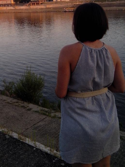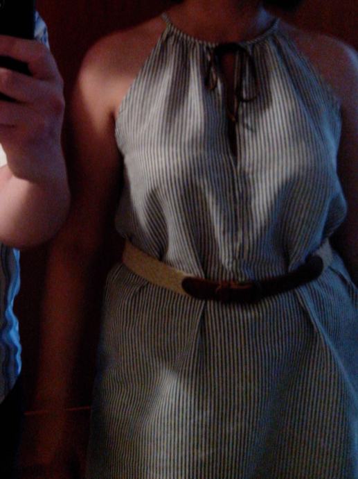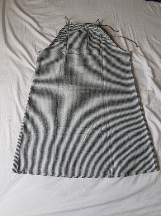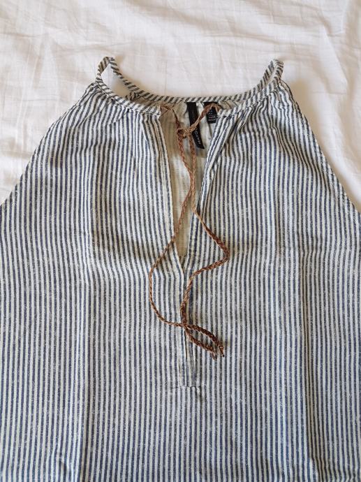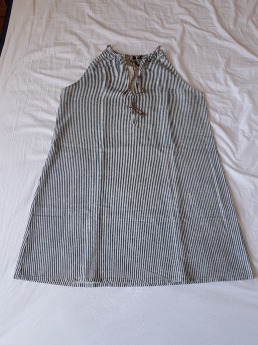 Mango haljina, na plavo bijele linije. Ispod vrata se veže špagicom, ima mali dekolte. Može se nositi sa i bez remena (kao na slici). Dužine je iznad koljena. Nošena samo jednom, odlično očuvana, kao nova. Materijal pamuk, lagana, ljetna. Veličina M (38).