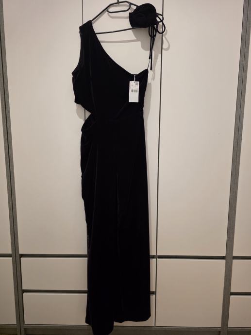 Baršunasti kombinezon tamnoljubičaste boje s odvojivom ružom u nijansi, asimetrični.