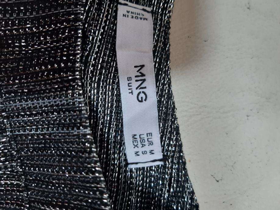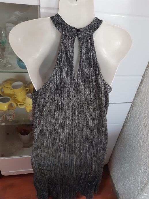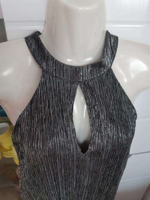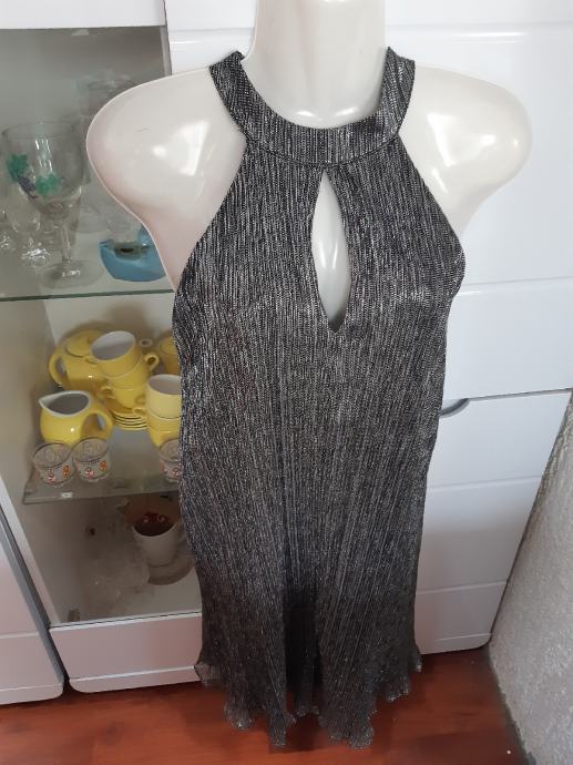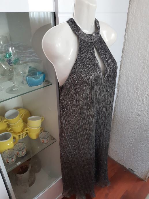 MANGO srebrna haljina, M vel., podstavljena, američki izrez, sirina prsa, prednja strana: 54 cm, dužina: 93 cm. Sastav: 100 % poliester.