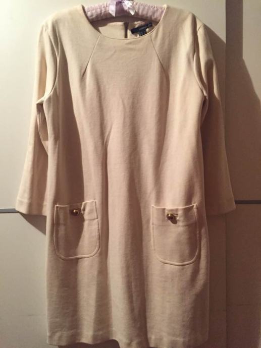 MANGO Suit efektna haljina boje šampanjca...vel.L-XL...pamuk sa elastinom...efektan “koktel “kroj haljine....elegantni 3/4 rukavi na lagani trapez...ukrasni đepovi sa zlatnim gumbima...zip otraga na leđima...materijal lijep” puniji “blago elastičan...bež podstava....