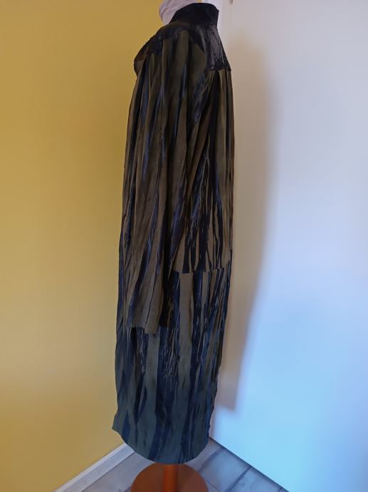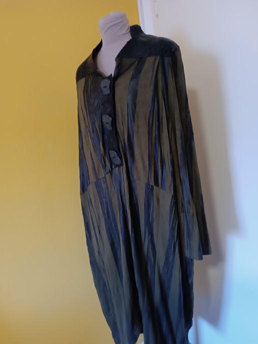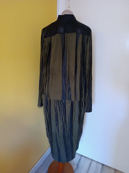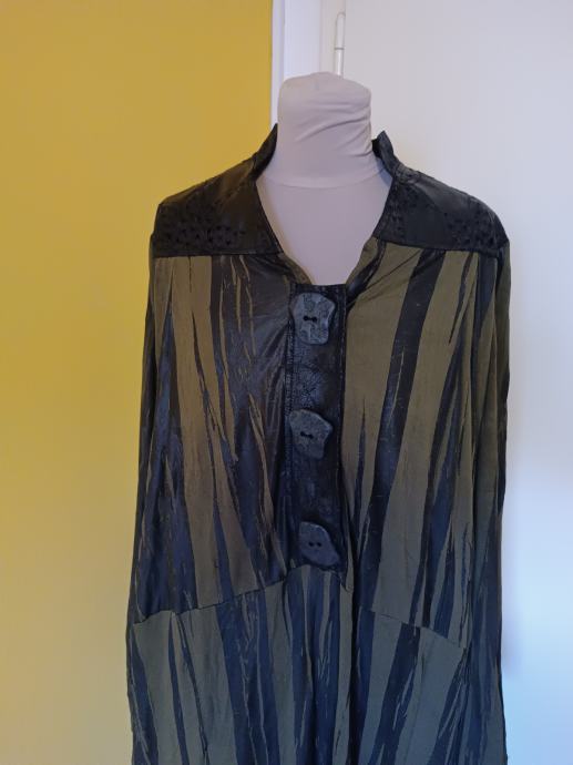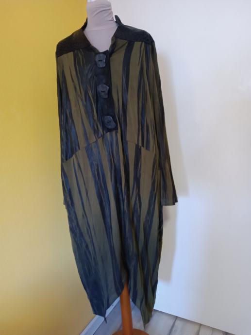 Asimetrična neobična haljina maslinasto zelene i crne boje. Veliki i neobični gumbi. Udobna i jedinstvenog stila. Ima detalje od eko kože.
