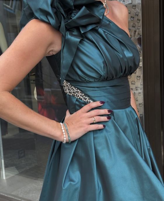 Prodajem maturalnu haljinu u petrol boji, veličina 42. Haljina je asimetričnog kroja, s jednim ramenom ukrašenim velikim voluminoznim cvijetom. Gornji dio je naborano drapiran, a u struku se nalazi dekorativni pojas s kristalnim detaljima koji dodatno naglašavaju liniju. Haljina je raskošna i lepršava, asimetričnog ruba koji sprijeda otkriva noge, dok straga pada u dužu liniju. Materijal je sjajnog, taftastog izgleda koji haljini daje svečan i elegantan dojam. Haljina je jednom nošena.
