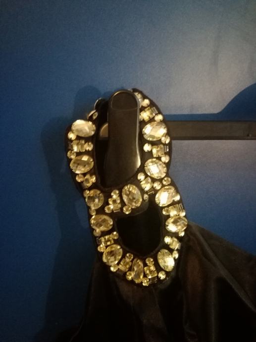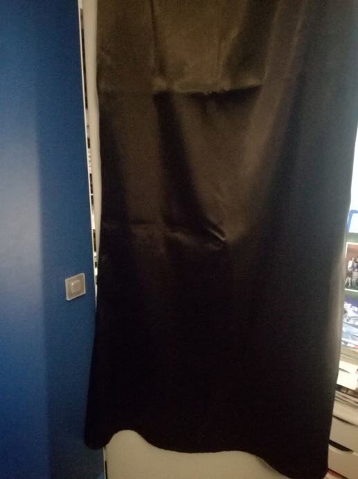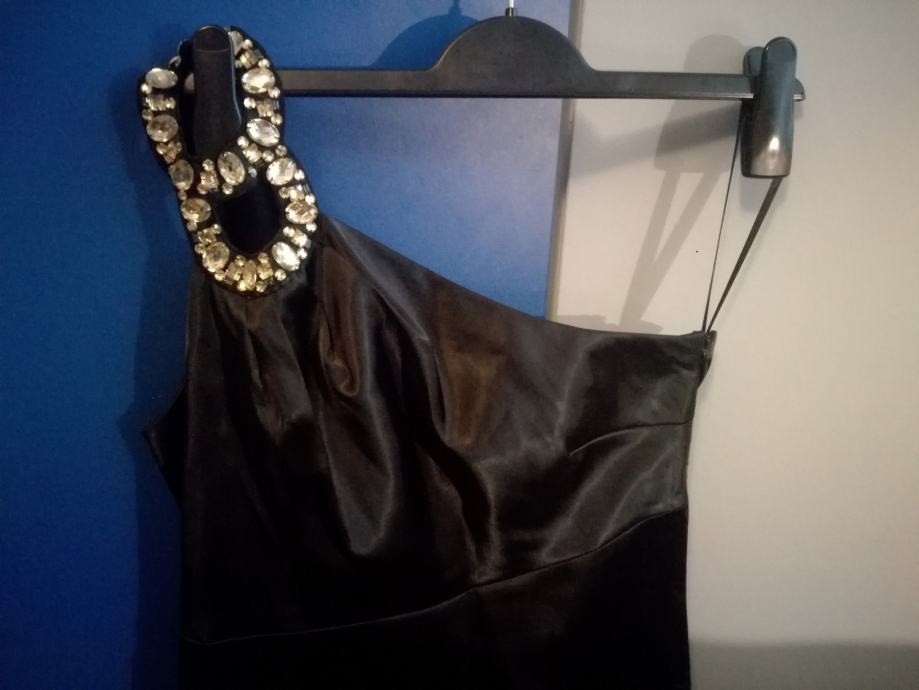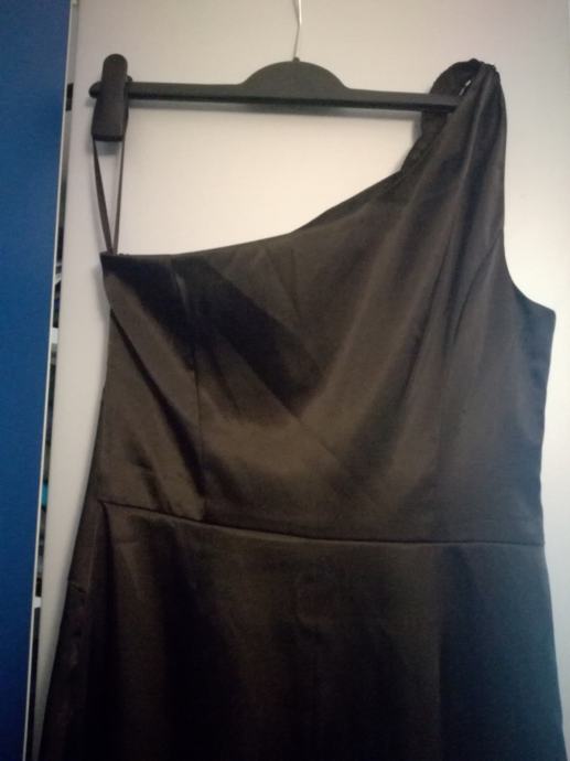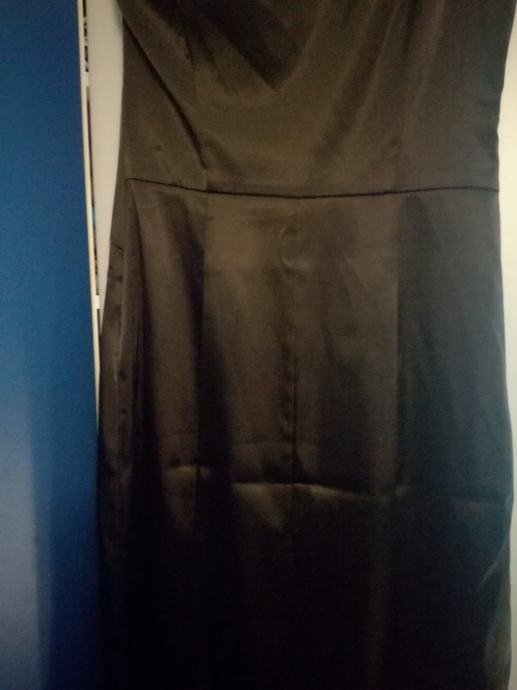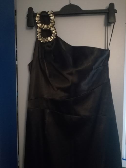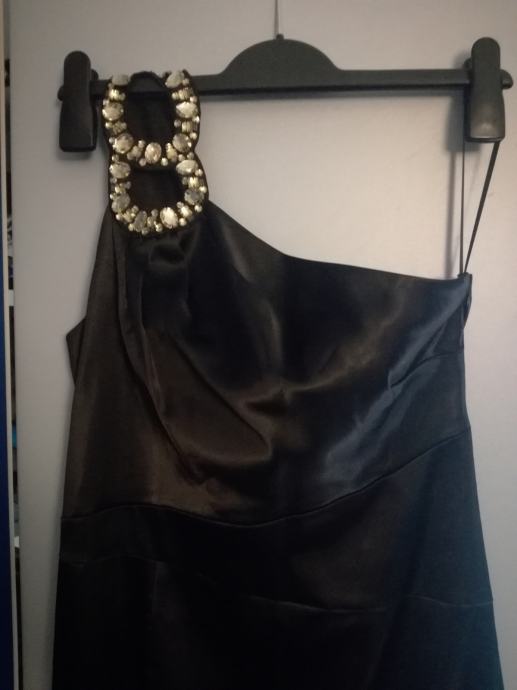 Svecana haljina od crnog satena, na desno rame s kristalicima kao ukras. Duga (maxi), strukirana. velicina 38.