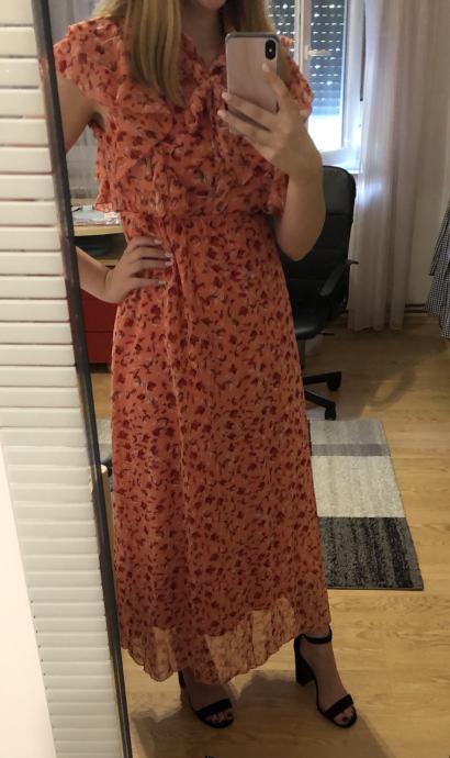 Prodajem novu maxi haljinu. Nikad nije nošena, samo oprana. Deklarirana kao veličina L, ali je zapravo S. Ima gumicu u struku. Duljina je oko 137 cm.