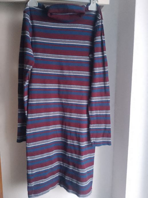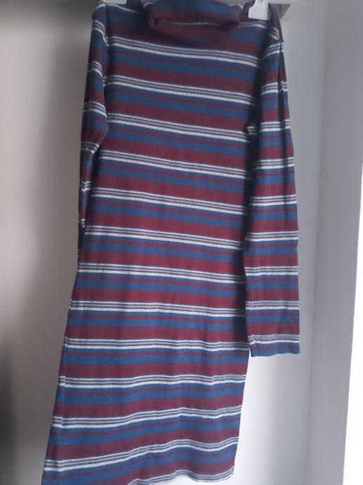 Midi prugasta ženska rolka / dolčevita zimska rastezljiva haljina dugih rukava, duljina do malo iznad koljena za visinu 173cm, veličina 36/38 , odnosno S/M . Kao nova , stanje 10/10 . Za jesen , zimu i proljeće . 5 e + pt