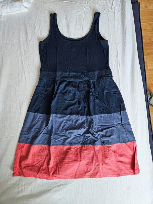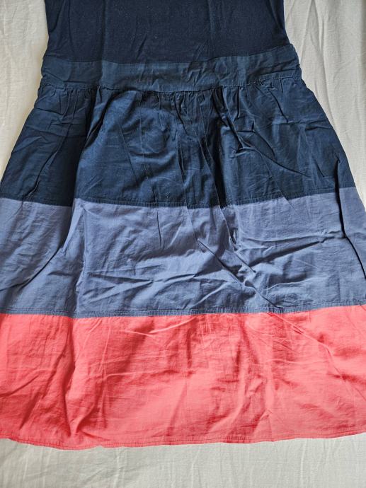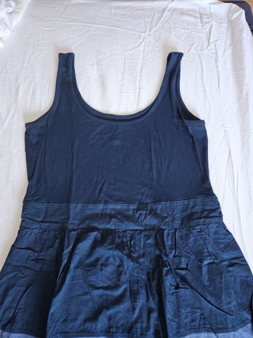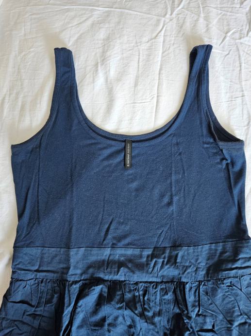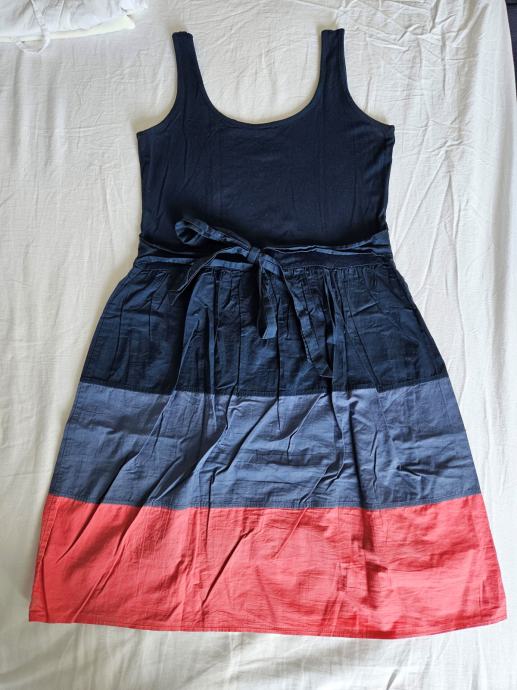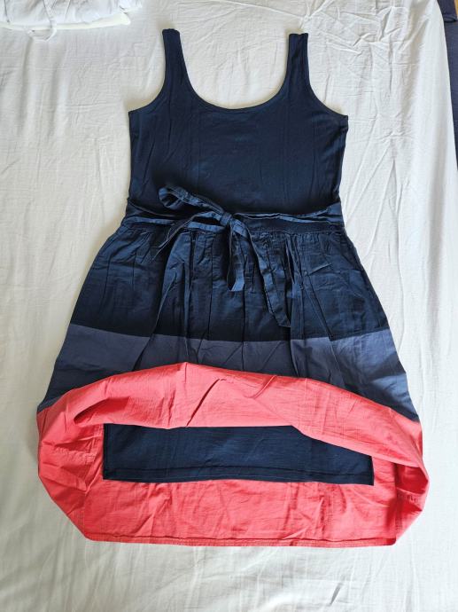 Prekrasna haljina marke Naf Naf. U prsima je elastični materijal, ispod toga je strukirana te se širi u A kroj. Podstavljena. Dužine iznad koljena. Lagana, ljetna. Veličina na deklaraciji XS, no pošto se dosta rasteže, stane komotno 36 / 38, S / M. Nošena, ali očuvana. Tamnoplave boje, sa sivoplavim i narančastocrvenim (koraljnim) dijelom.
