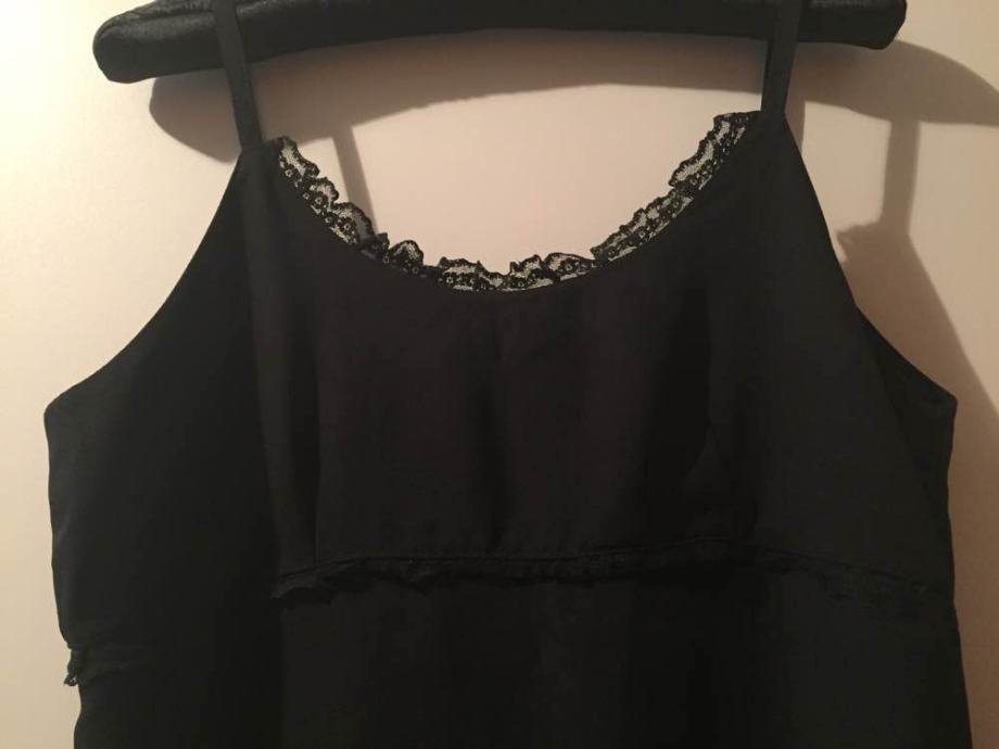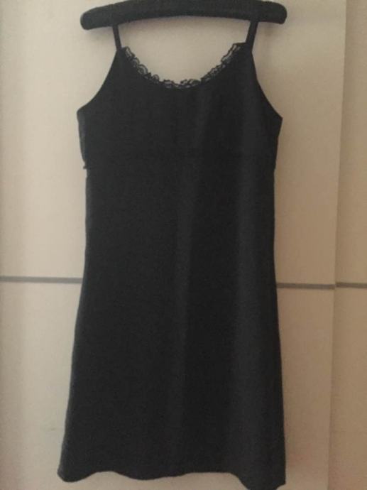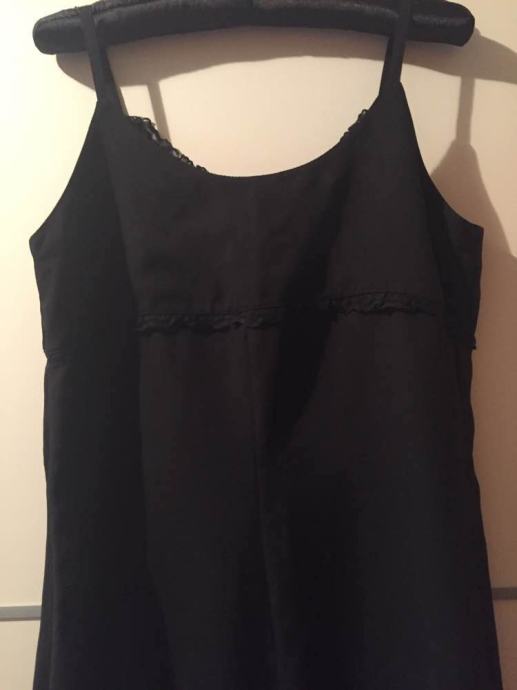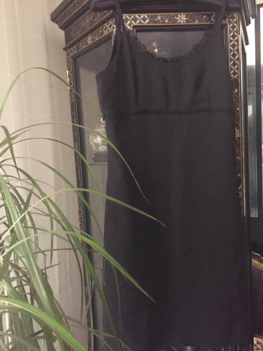 NO STRESS efektna “mala” crna slip haljina na bretele sa ukrasnom čipkom..(na mjestu gdje je haljina efektno rezana ispod prsiju)....elegantna na lagani trapez..zip bočno...čipka i sa leđne strane ...sa detaljem efektne čipke pogodna i za večernje kombinacije,ugodna mix viskoza..ne gužva se....vel.L