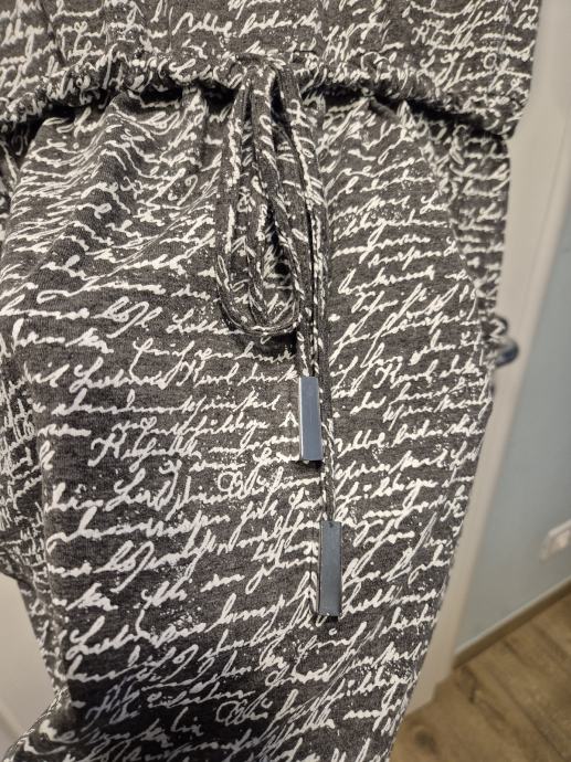 Dužina je cca do koljena (ovisno o visini osobe) a struk je naglašen vezicama koje omogućuju podešavanje. Haljina ima suptilni sitni uzorak teksta i džepove sa strane. Idealna za svaki dan.