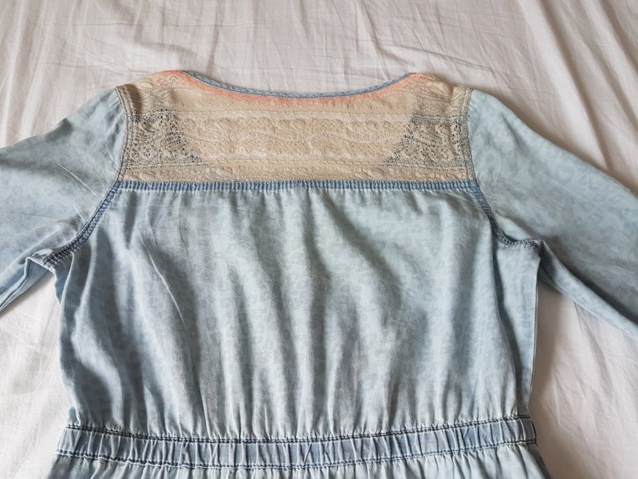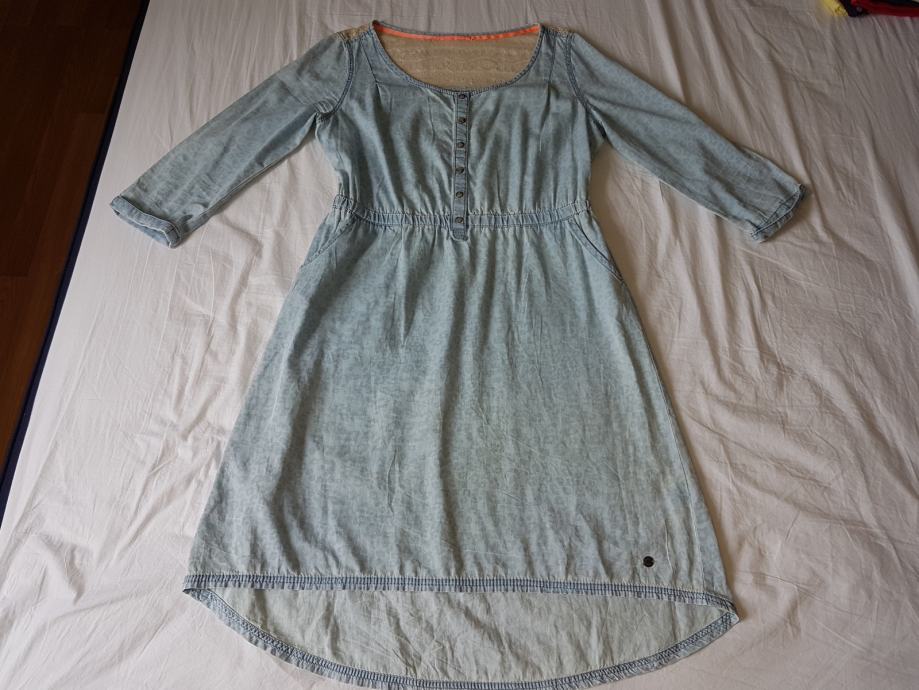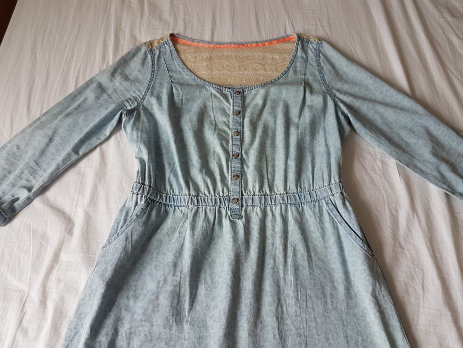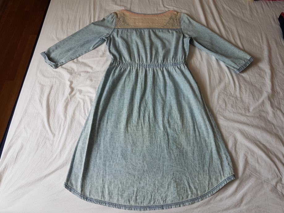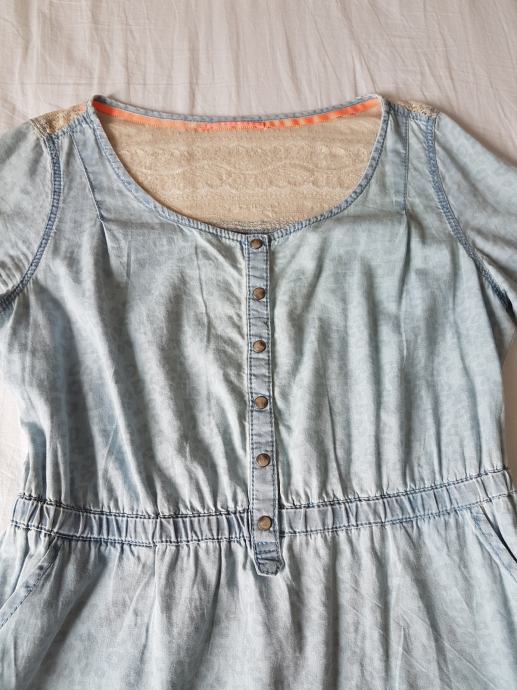 Prekrasna haljina marke s.Oliver veličine 40 (L). Materijal je pamuk, a boja je svijetlo plava poput jeansa, sa leopard uzorkom. Na leđima ima bijelu čipku. Asimetrična - odostraga malo duža nego naprijed, seže do razine koljena. Rukavi su 3/4 dužine. Samo isprobana, nije nikada nošena, dakle izgleda kao nova. Plaćena 450kn u trgovini. Slika kako stoji, (7.slika po redu) skinuta s interneta.