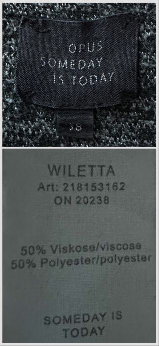 Deklarirani komotni 38, za 38 i 40. Mjere: dužina 94 cm, ramena 41 cm, prsa 47 cm, struk 50 cm, rukav 62/49 cm.