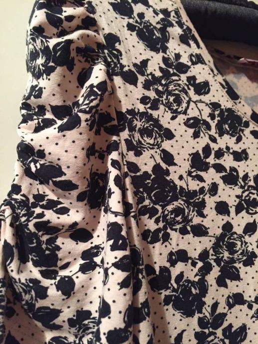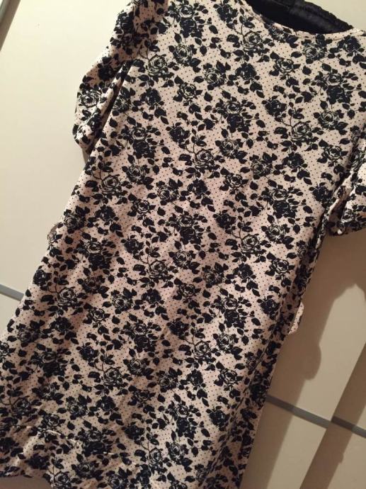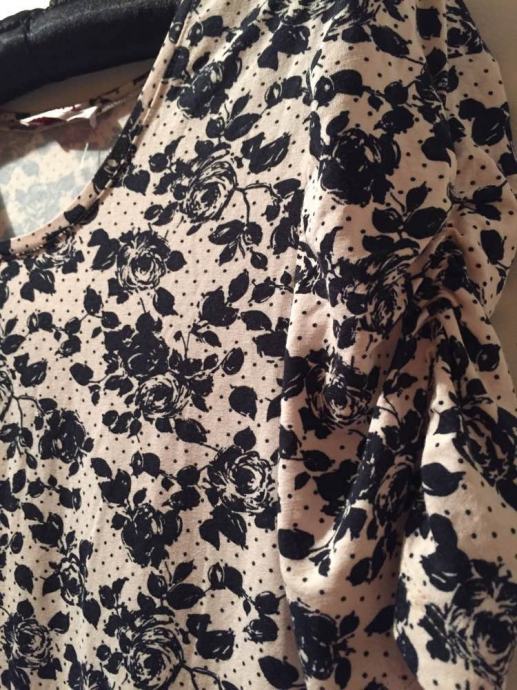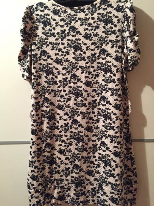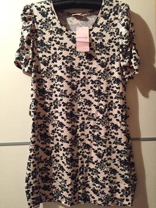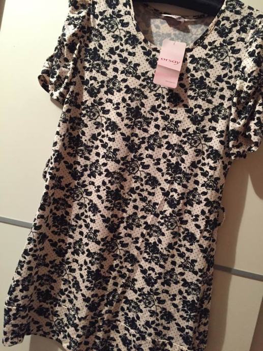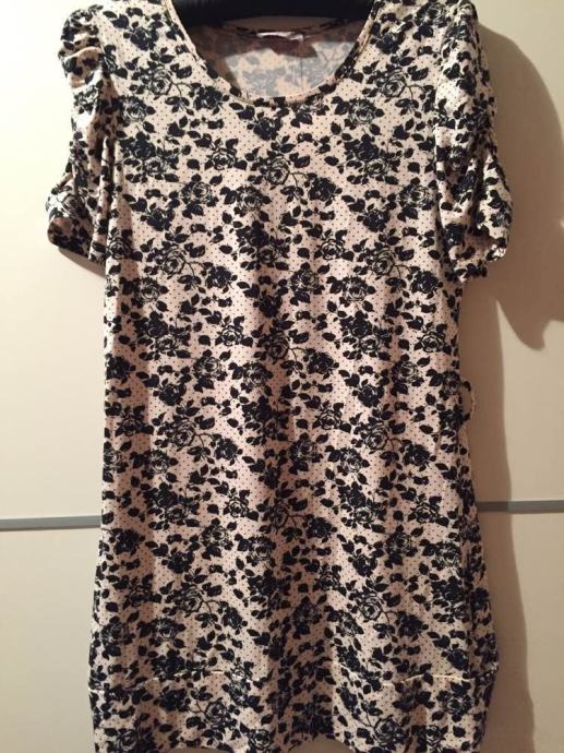 ORSAY cvjetna mini haljina tunika sa etiketom..pastelno roza bež sa crnim cvjetnim printom...rukavi efektno naborani..viskoza 96% elastin 4%..lijepo pada..može se nositi na remen..vel.38-40...dekl.L
