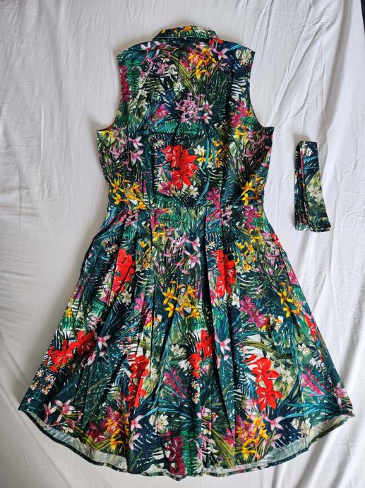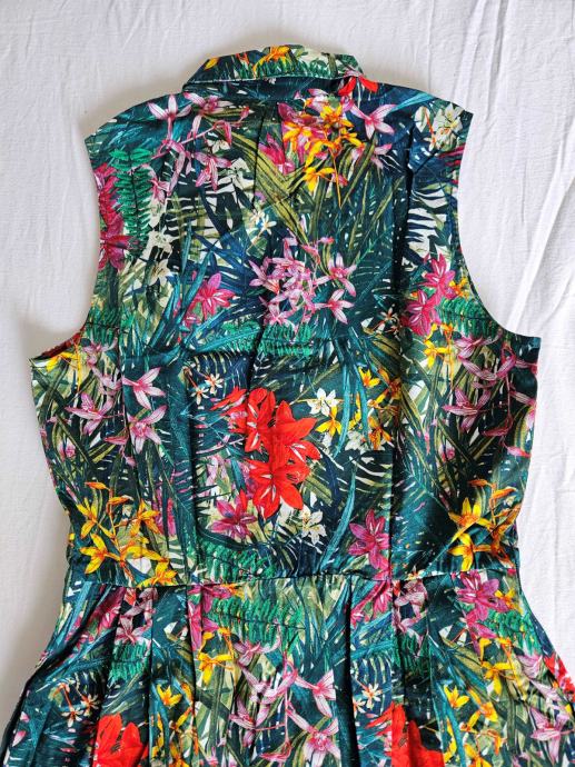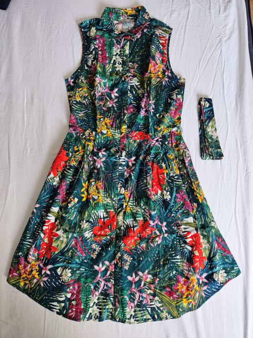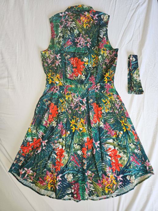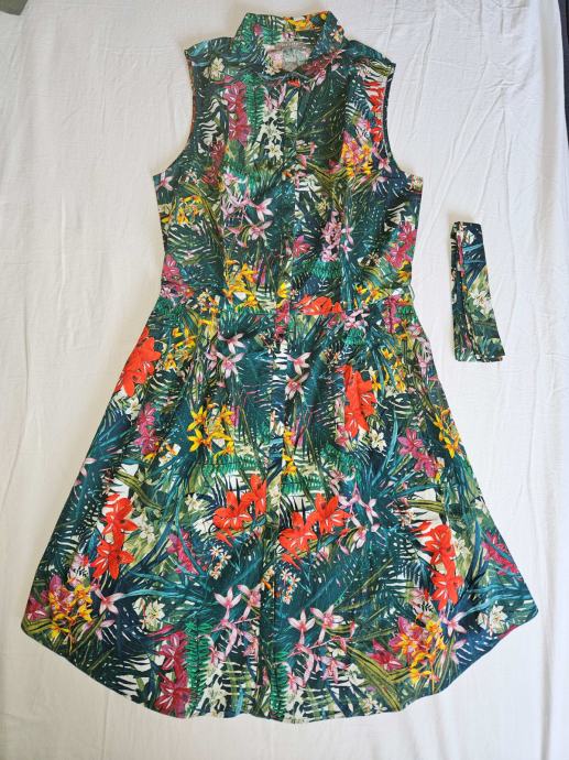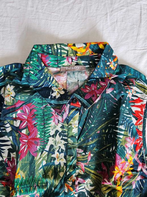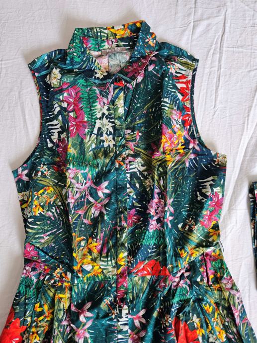 Haljina marke Orsay, zanimljivi jungle uzorak. Ima malu kragnicu, strukirana, A kroj, ima gumbe po sredini te uz nju dolazi remen u istoj boji koji se stavi oko struka. Dužine malo iznad koljena. Nošena svega par puta, očuvana bez oštećenja. Veličina 38, M. Pamučna, lagano rastezljiva, ugodna za nositi.