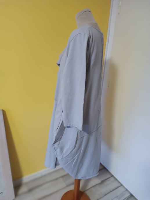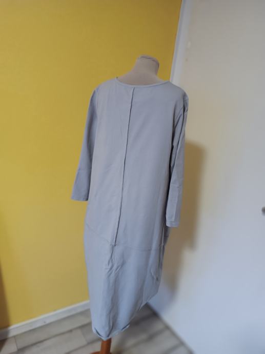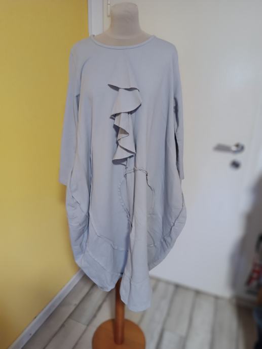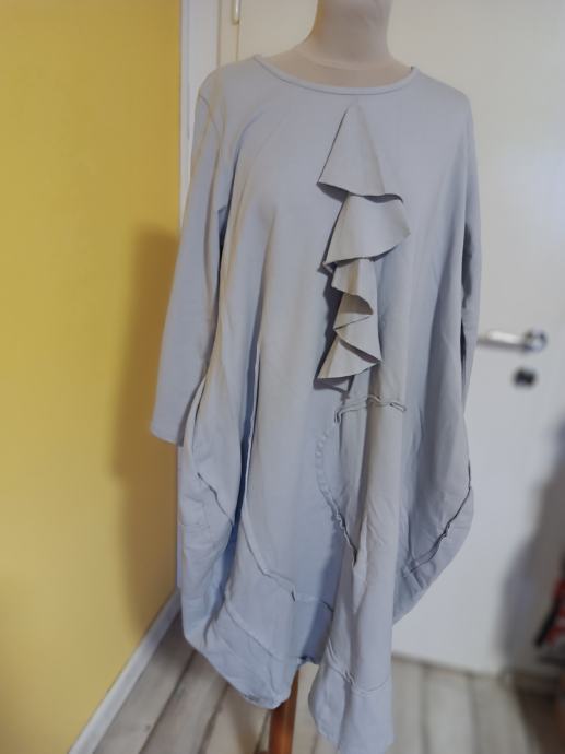 Oversize svijetlo siva haljina s opuštenim krojem, dugim rukavima i ukrasnim volanima sprijeda. Džepovi su na bočnim šavovima. Nova s etiketom.